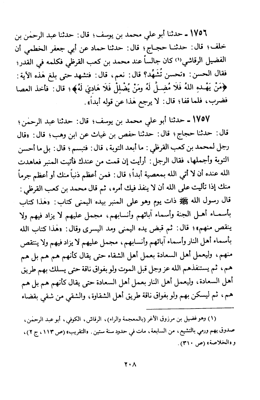 1756 - حَدَّثَنَا أَبُو عَلِيٍّ مُحَمَّدُ بْنُ يُوسُفَ قَالَ: حَدَّثَنَا عَبْدُ الرَّحْمَنِ بْنُ خَلَفٍ، قَالَ: حَدَّثَنَا حَجَّاجٌ، قَالَ: حَدَّثَنَا حَمَّادٌ، عَنْ أَبِي جَعْفَرٍ الْخَطْمِيِّ، أَنَّ الْفُضَيْلَ الرَّقَاشِيَّ، كَانَ جَالِسًا عِنْدَ مُحَمَّدِ بْنِ كَعْبٍ الْقُرَظِيِّ , فَكَلَّمَهُ فِي الْقَدَرِ، فَقَالَ الْحَسَنُ: " §تُحْسِنُ تَشَهَّدُ؟ قَالَ: نَعَمْ , قَالَ: فَتَشَهَّدَ حَتَّى بَلَغَ هَذِهِ: مَنْ يَهْدِهِ اللَّهِ فَلَا مُضِلَّ لَهُ، وَمَنْ يُضْلِلْ فَلَا هَادِيَ لَهُ، قَالَ: فَأَخَذَ الْعَصَا فَضَرَبَ، فَلَمَّا قَفَّا قَالَ: لَا يَرْجِعُ هَذَا عَنْ قَوْلِهِ أَبَدًا "