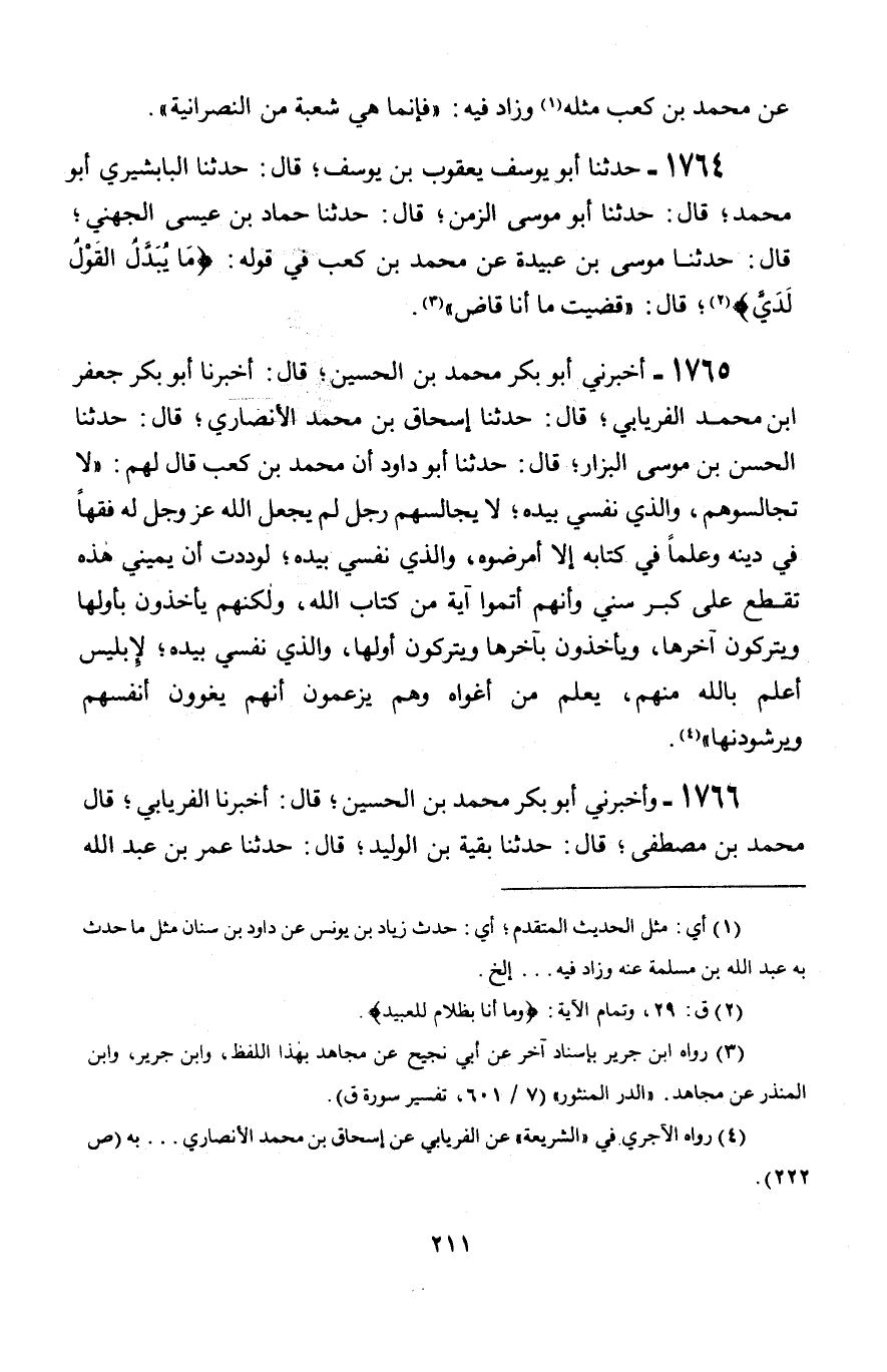 1765 - أَخْبَرَنِي أَبُو بَكْرٍ مُحَمَّدُ بْنُ الْحُسَيْنِ قَالَ: أَخْبَرَنَا أَبُو بَكْرٍ جَعْفَرُ بْنُ مُحَمَّدٍ الْفِرْيَابِيُّ قَالَ: حَدَّثَنَا إِسْحَاقُ بْنُ مُحَمَّدٍ الْأَنْصَارِيُّ، قَالَ: حَدَّثَنَا الْحَسَنُ بْنُ مُوسَى الْبَزَّارُ، قَالَ: حَدَّثَنَا أَبُو دَاوُدَ، أَنَّ مُحَمَّدَ بْنَ كَعْبٍ، قَالَ لَهُمْ: «§لَا تُجَالِسُوهُمْ، وَالَّذِي نَفْسِي بِيَدِهِ، لَا يُجَالِسُهُمْ رَجُلٌ لَمْ يَجْعَلِ اللَّهُ عَزَّ وَجَلَّ لَهُ فِقْهًا فِي دِينِهِ وَعِلْمًا فِي كِتَابِهِ إِلَّا أَمْرَضُوهُ، وَالَّذِي نَفْسِي بِيَدِهِ، لَوَدِدْتُ أَنَّ يَمِينِي هَذِهِ تُقْطَعُ عَلَى كِبَرِ سِنِّي وَأَنَّهُمْ أَتَمُّوا آيَةً مِنْ كِتَابِ اللَّهِ، وَلَكِنَّهُمْ يَأْخُذُونَ بِأَوَّلِهَا وَيَتْرُكُونَ آخِرَهَا وَيَأْخُذُونَ بِآخِرِهَا وَيَتْرُكُونَ أَوَّلَهَا وَالَّذِي نَفْسِي بِيَدِهِ لَإِبْلِيسُ أَعْلَمُ بِاللَّهِ مِنْهُمْ، يَعْلَمُ مَنْ أَغْوَاهُ وَهُمْ يَزْعُمُونَ أَنَّهُمْ يُغْوُونَ أَنْفُسَهُمْ وَيُرْشِدُونَهَا»