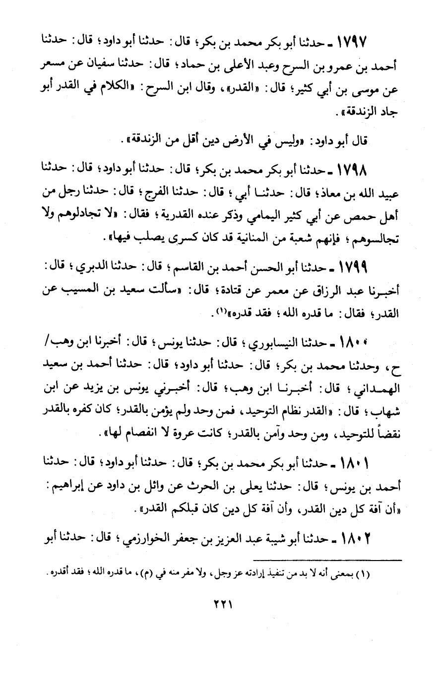 1797 - حَدَّثَنَا أَبُو بَكْرٍ مُحَمَّدُ بْنُ بَكْرٍ قَالَ: حَدَّثَنَا أَبُو دَاوُدَ، قَالَ: حَدَّثَنَا أَحْمَدُ بْنُ عَمْرِو بْنِ السَّرْحِ، وَعَبْدُ الْأَعْلَى بْنُ حَمَّادٍ، قَالَ: حَدَّثَنَا سُفْيَانُ، عَنْ مِسْعَرٍ، عَنْ مُوسَى بْنِ أَبِي كَثِيرٍ قَالَ: «§الْقَدَرُ»، وَقَالَ ابْنُ السَّرْحِ: «الْكَلَامُ فِي الْقَدَرِ أَبُو جَادِ الزَّنْدَقَةِ» قَالَ أَبُو دَاوُدَ: «وَلَيْسَ فِي الْأَرْضِ دِينٌ أَقَلَّ مِنَ الزَّنْدَقَةِ»