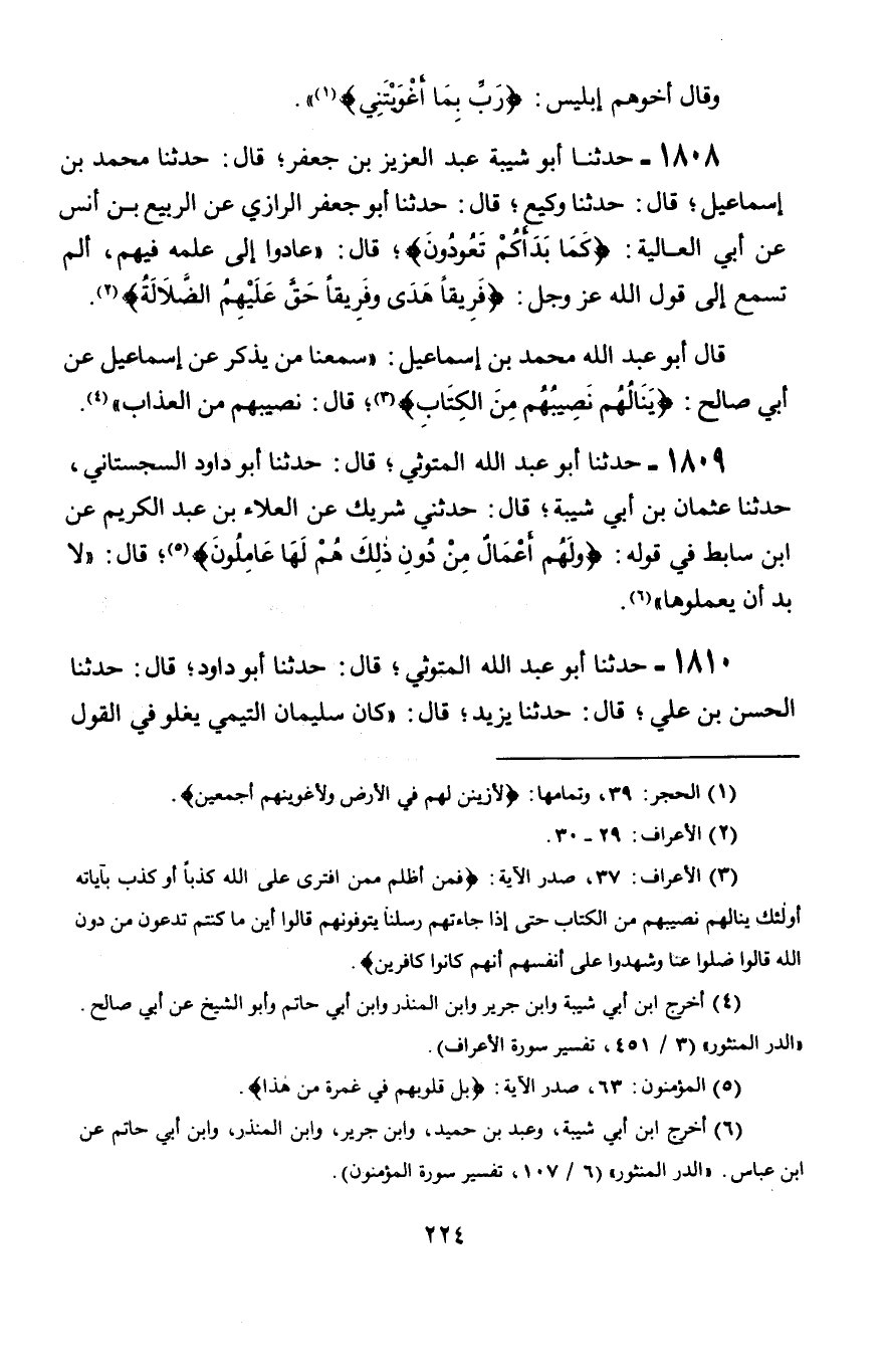 1809 - حَدَّثَنَا أَبُو عَبْدِ اللَّهِ الْمَتُّوثِيُّ، قَالَ: حَدَّثَنَا أَبُو دَاوُدَ السِّجِسْتَانِيُّ، حَدَّثَنَا عُثْمَانُ بْنُ أَبِي شَيْبَةَ قَالَ: حَدَّثَنِي شَرِيكٌ، عَنِ الْعَلَاءِ بْنِ عَبْدِ الْكَرِيمِ، عَنِ ابْنِ سَابِطٍ، فِي قَوْلِهِ: " {§وَلَهُمْ أَعْمَالٌ مِنْ دُونِ ذَلِكَ هُمْ لَهَا عَامِلُونَ} [المؤمنون: 63] قَالَ: «لَا بُدَّ أَنْ يَعْمَلُوهَا»
