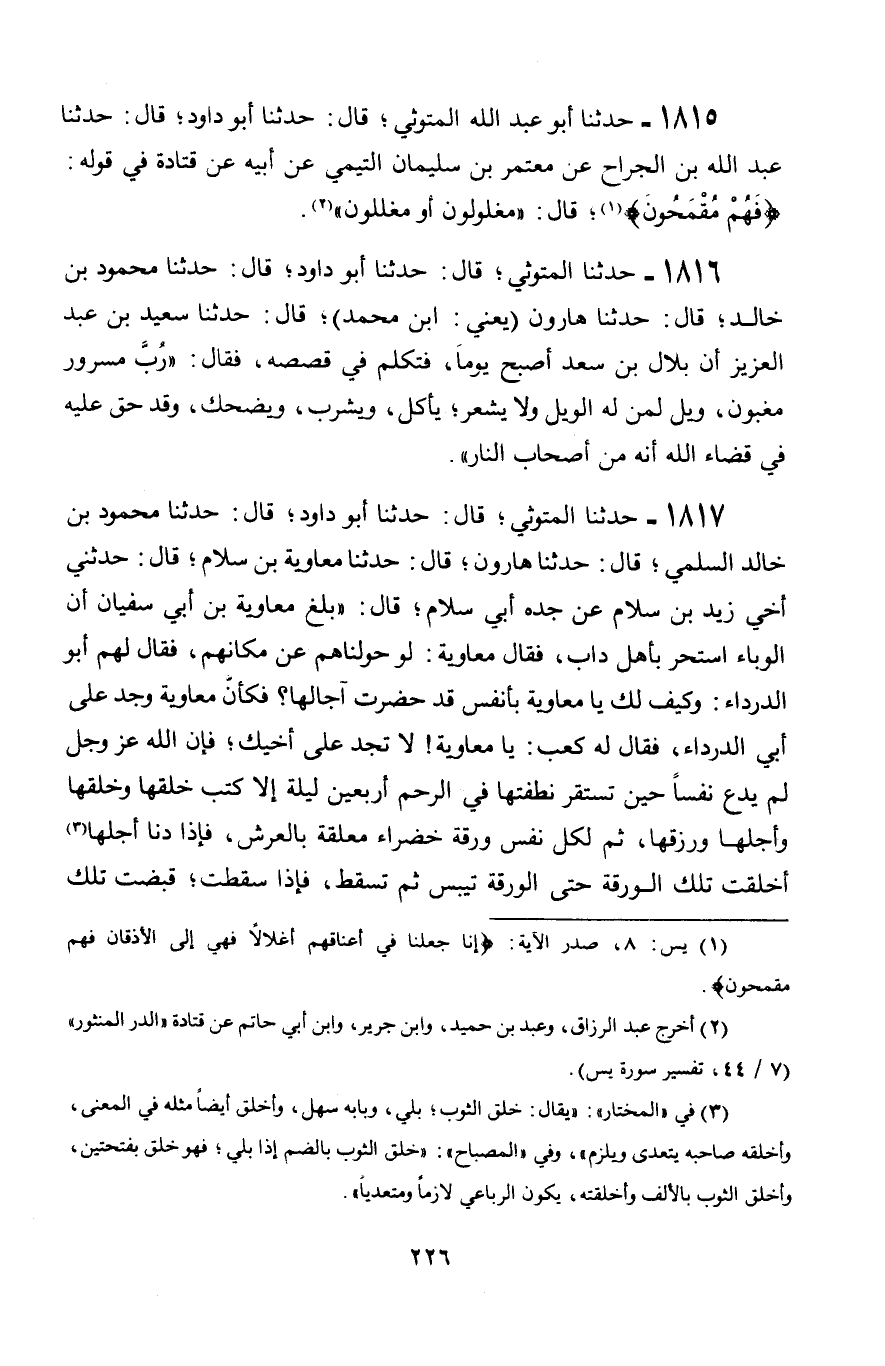 1816 - حَدَّثَنَا الْمَتُّوثِيُّ، قَالَ: حَدَّثَنَا أَبُو دَاوُدَ، قَالَ: حَدَّثَنَا مَحْمُودُ بْنُ خَالِدٍ، قَالَ: حَدَّثَنَا هَارُونُ يَعْنِي ابْنَ مُحَمَّدٍ قَالَ: حَدَّثَنَا سَعِيدُ بْنُ عَبْدِ الْعَزِيزِ، أَنَّ بِلَالَ بْنَ سَعْدٍ، أَصْبَحَ يَوْمًا، فَتَكَلَّمَ فِي قَصَصِهِ فَقَالَ: «§رُبَّ مَسْرُورٍ مَغْبُونٌ، وَيْلٌ لِمَنْ لَهُ الْوَيْلُ وَلَا يَشْعُرُ، يَأْكُلُ، وَيَشْرَبُ، وَيَضْحَكُ، وَقَدْ حَقَّ عَلَيْهِ فِي قَضَاءِ اللَّهِ أَنَّهُ مِنْ أَصْحَابِ النَّارِ»