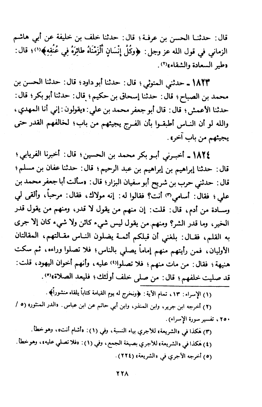 1824 - أَخْبَرَنِي أَبُو بَكْرٍ مُحَمَّدُ بْنُ الْحُسَيْنِ قَالَ: أَخْبَرَنَا الْفِرْيَابِيُّ، قَالَ: حَدَّثَنَا إِبْرَاهِيمُ بْنُ إِبْرَاهِيمَ بْنِ عَبْدِ الرَّحِيمِ، قَالَ: حَدَّثَنَا عَفَّانُ بْنُ مُسْلِمٍ، قَالَ: حَدَّثَنِي حَرْبُ بْنُ سُرَيْجٍ أَبُو سُفْيَانَ الْبَزَّارُ، قَالَ: سَأَلْتُ أَبَا جَعْفَرٍ مُحَمَّدَ بْنَ عَلِيٍّ، فَقَالَ: " §أَسَامِيٌّ أَنْتَ؟ فَقَالُوا لَهُ: إِنَّهُ مَوْلَاكَ، فَقَالَ: مَرْحَبًا، وَأَلْقَى لِي وِسَادَةً مِنْ أَدَمٍ قَالَ: قُلْتُ: إِنَّ مِنْهُمْ مَنْ يَقُولُ: لَا قَدَرَ، وَمِنْهُمْ مَنْ يَقُولُ: قَدَّرَ الْخَيْرَ، وَمَا قَدَّرَ الشَّرَّ؟ وَمِنْهُمْ مَنْ يَقُولُ: لَيْسَ شَيْءٌ كَائِنًا وَلَا شَيْءٌ كَانَ إِلَّا جَرَى بِهِ الْقَلَمُ، فَقَالَ: بَلَغَنِي أَنَّ قِبَلَكُمْ أَئِمَّةً يُضِلُّونَ النَّاسَ مَقَالَتُهُمْ، الْمَقَالَتَانِ الْأُولَيَانِ، فَمَنْ رَأَيْتَهُمْ مِنْهُمْ إِمَامًا يُصَلِّي بِالنَّاسِ، فَلَا تُصَلُّوا وَرَاءَهُ، ثُمَّ سَكَتَ هُنَيْهَةً، فَقَالَ: مَنْ مَاتَ مِنْهُمْ، فَلَا تُصَلُّوا عَلَيْهِ، وَإِنَّهُمْ إِخْوَانُ الْيَهُودِ، قُلْتُ: قَدْ صَلَّيْتُ خَلْفَهُمْ؟ قَالَ: مَنْ صَلَّى خَلْفَ أُولَئِكَ فَلْيُعِدِ الصَّلَاةَ "