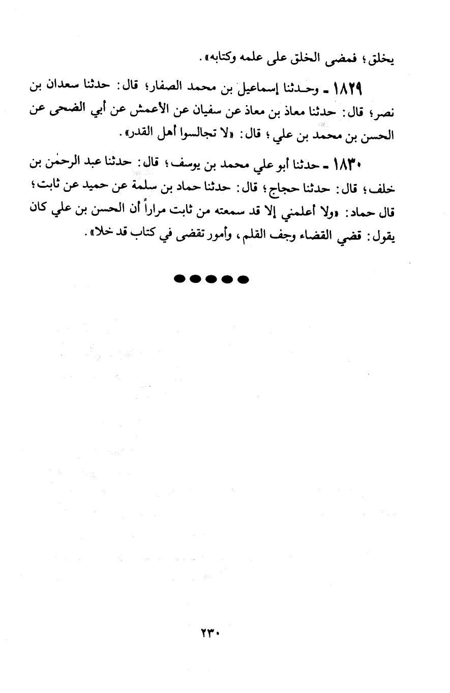 1830 - حَدَّثَنَا أَبُو عَلِيٍّ مُحَمَّدُ بْنُ يُوسُفَ قَالَ: حَدَّثَنَا عَبْدُ الرَّحْمَنِ بْنُ خَلَفٍ، قَالَ: حَدَّثَنَا حَجَّاجٌ، قَالَ: حَدَّثَنَا حَمَّادُ بْنُ سَلَمَةَ، عَنْ حُمَيْدٍ، عَنْ ثَابِتٍ، قَالَ حَمَّادٌ: " وَلَا أَعْلَمُنِي إِلَّا قَدْ سَمِعْتُهُ مِنْ ثَابِتٍ مِرَارًا أَنَّ الْحَسَنَ بْنَ عَلِيٍّ كَانَ يَقُولُ: «§قُضِيَ الْقَضَاءُ وَجَفَّ الْقَلَمُ، وَأُمُورٌ تُقْضَى فِي كِتَابٍ قَدْ خَلَا»