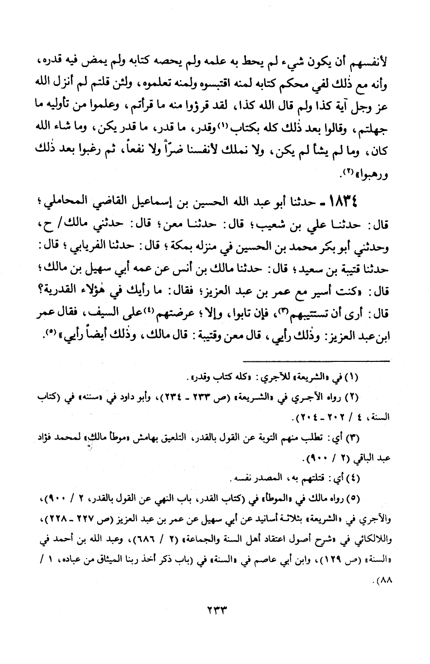 1834 - حَدَّثَنَا أَبُو عَبْدِ اللَّهِ الْحُسَيْنُ بْنُ إِسْمَاعِيلَ الْقَاضِي الْمَحَامِلِيُّ، قَالَ: حَدَّثَنَا عَلِيُّ بْنُ شُعَيْبٍ، قَالَ: حَدَّثَنَا مَعْنٌ، قَالَ: حَدَّثَنِي مَالِكٌ، ح، وَحَدَّثَنِي أَبُو بَكْرٍ مُحَمَّدُ بْنُ الْحُسَيْنِ فِي مَنْزِلِهِ بِمَكَّةَ قَالَ: حَدَّثَنَا الْفِرْيَابِيُّ، قَالَ: حَدَّثَنَا قُتَيْبَةُ بْنُ سَعِيدٍ، قَالَ: حَدَّثَنَا مَالِكُ بْنُ أَنَسٍ، عَنْ عَمِّهِ أَبِي سُهَيْلِ بْنِ مَالِكٍ قَالَ: " كُنْتُ أَسِيرُ مَعَ عُمَرَ بْنِ عَبْدِ الْعَزِيزِ، فَقَالَ: " §مَا رَأْيُكَ فِي هَؤُلَاءِ الْقَدَرِيَّةِ؟ قَالَ: أَرَى أَنْ تَسْتَتِيبَهُمْ، فَإِنْ تَابُوا، وَإِلَّا عَرَضْتَهُمْ عَلَى السَّيْفِ، فَقَالَ عُمَرُ بْنُ عَبْدِ الْعَزِيزِ. وَذَلِكَ رَأْيِي , قَالَ: مَعْنٌ وَقُتَيْبَةُ: قَالَ مَالِكٌ: وَذَلِكَ أَيْضًا رَأْيِي "