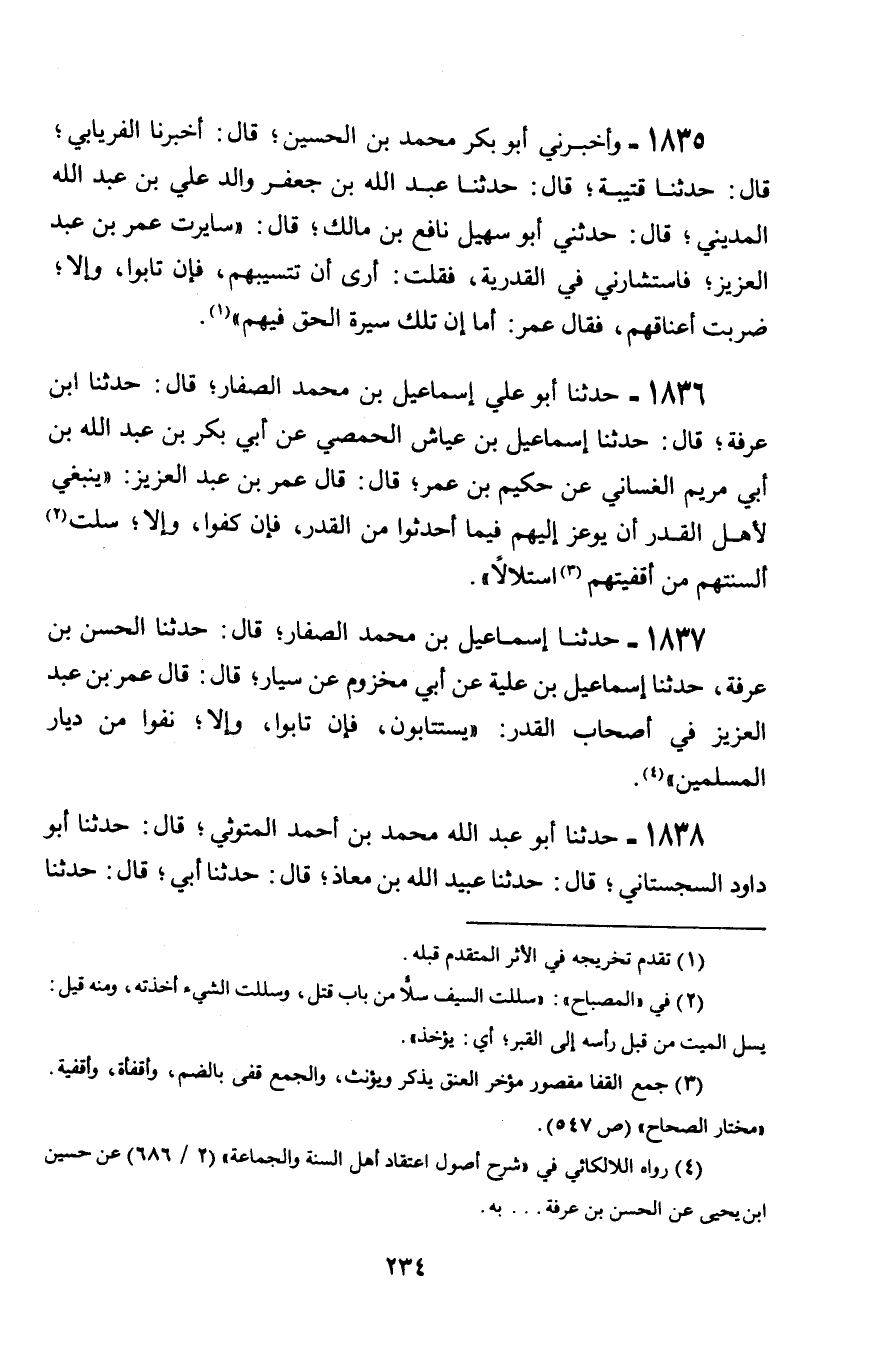 1836 - حَدَّثَنَا أَبُو عَلِيٍّ إِسْمَاعِيلُ بْنُ مُحَمَّدٍ الصَّفَّارُ قَالَ: حَدَّثَنَا ابْنُ عَرَفَةَ، قَالَ: حَدَّثَنَا إِسْمَاعِيلُ بْنُ عَيَّاشٍ الْحِمْصِيُّ، عَنْ أَبِي بَكْرِ بْنِ عَبْدِ اللَّهِ بْنِ أَبِي مَرْيَمَ الْغَسَّانِيِّ، عَنْ حَكِيمِ بْنِ عُمَرَ، قَالَ: قَالَ عُمَرُ بْنُ عَبْدِ الْعَزِيزِ: § «يَنْبَغِي لِأَهْلِ الْقَدَرِ أَنْ يُوعَزَ إِلَيْهِمْ فِيمَا أَحْدَثُوا مِنَ الْقَدَرِ، فَإِنْ كَفُّوا، وَإِلَّا سُلَّتْ أَلْسِنَتُهُمْ مِنْ أَقْفِيَتِهِمُ اسْتِلَالًا»