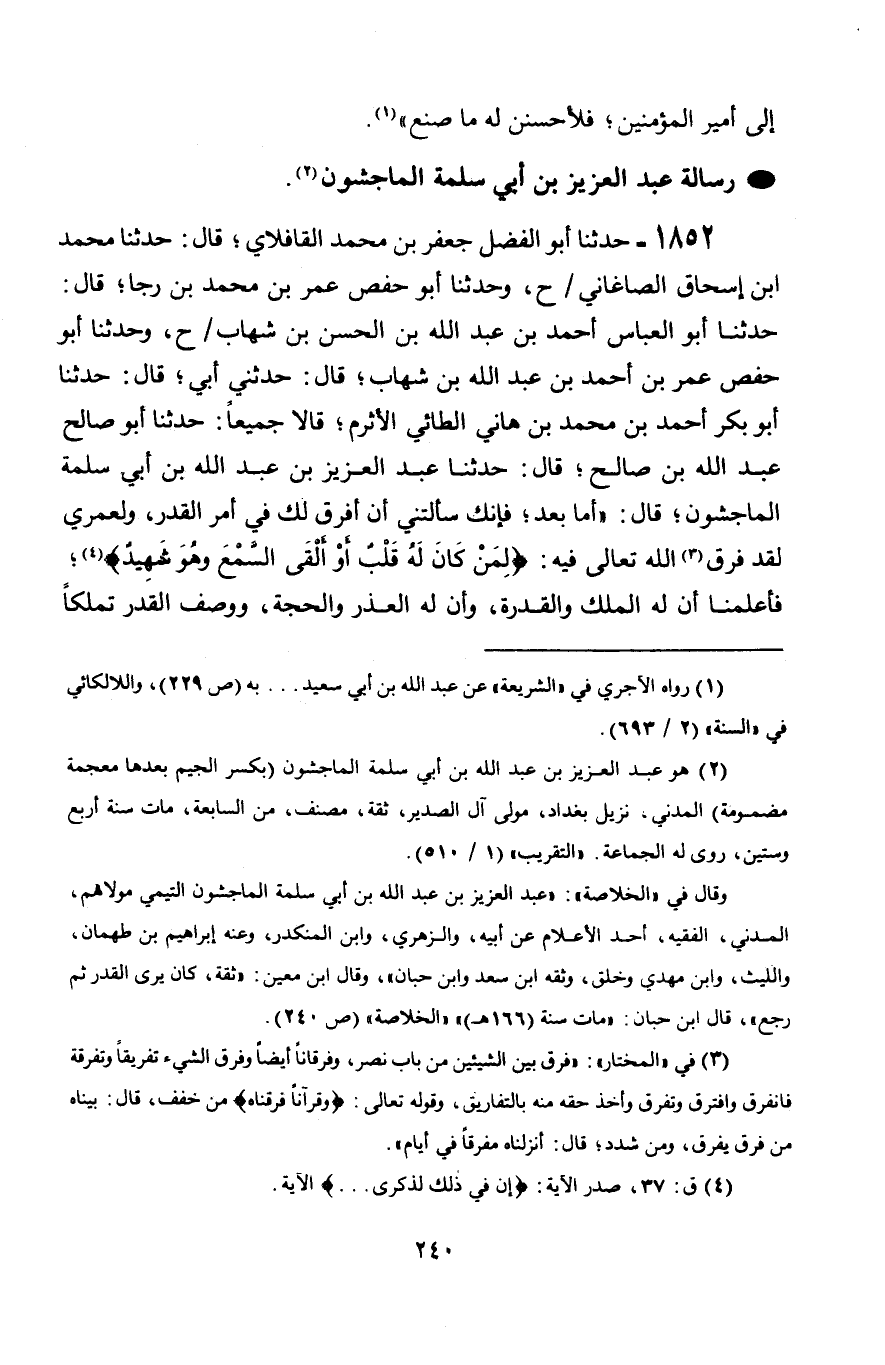 1852 - حَدَّثَنَا أَبُو الْفَضْلِ جَعْفَرُ بْنُ مُحَمَّدٍ الْقَافْلَائِيُّ قَالَ: حَدَّثَنَا مُحَمَّدُ بْنُ إِسْحَاقَ الصَّاغَانِيُّ، ح وَحَدَّثَنَا أَبُو حَفْصٍ عُمَرُ بْنُ مُحَمَّدِ بْنِ رَجَا قَالَ: حَدَّثَنَا أَبُو الْعَبَّاسِ أَحْمَدُ بْنُ عَبْدِ اللَّهِ بْنِ الْحَسَنِ بْنِ شِهَابٍ ح وَحَدَّثَنَا أَبُو حَفْصٍ عُمَرُ بْنُ أَحْمَدَ بْنِ عَبْدِ اللَّهِ بْنِ شِهَابٍ قَالَ: حَدَّثَنِي أَبِي، قَالَ: حَدَّثَنَا أَبُو بَكْرٍ أَحْمَدُ بْنُ مُحَمَّدِ بْنِ هَانِئٍ الطَّائِيُّ الْأَثْرَمُ، قَالَا جَمِيعًا: حَدَّثَنَا أَبُو صَالِحٍ عَبْدُ اللَّهِ بْنُ صَالِحٍ، قَالَ: حَدَّثَنَا عَبْدُ الْعَزِيزِ بْنُ عَبْدِ اللَّهِ بْنِ أَبِي سَلَمَةَ الْمَاجِشُونُ قَالَ: " §أَمَّا بَعْدُ، فَإِنَّكَ سَأَلْتَنِي أَنْ أُفَرِّقَ لَكَ فِى أَمْرِ الْقَدَرِ، وَلَعَمْرِي لَقَدْ فَرَّقَ اللَّهُ تَعَالَى فِيهِ {لِمَنْ كَانَ لَهُ قَلْبٌ أَوْ أَلْقَى السَّمْعَ وَهُوَ شَهِيدٌ} [ق: 37]، فَأَعْلَمَنَا أَنَّ لَهُ الْمُلْكَ وَالْقُدْرَةَ، وَأَنَّ لَهُ الْعُذْرَ وَالْحُجَّةَ، وَوَصَفَ الْقَدَرَ تَمَلُّكًا -[241]- وَالْحُجَّةَ إِنْذَارًا، وَوَصَفَ الْإِنْسَانَ فِي ذَلِكَ مُحْسِنًا وَمُسِيئًا وَمَقْدُورًا عَلَيْهِ , وَمَعْذُورًا عَلَيْهِ، فَرَزَقَهُ الْحَسَنَةَ وَحَمِدَهُ عَلَيْهَا، وَقَدَّرَ عَلَيْهِ الْخَطِيئَةَ وَلَامَهُ فِيهَا، فَحَسِبْتَ حِينَ حَمِدَهُ وَلَامَهُ أَنَّهُ مُمَلِّكٌ، وَنَسِيتَ انْتَحَالَهُ الْقَدَرَ؛ لِأَنَّهُ مُمَلِّكٌ، فَلَمْ يُخْرِجْهُ بِالْمَحْمَدَةِ وَاللَّائِمَةِ مِنْ مُلْكِهِ، وَلَا يَعْذِرُهُ بِالْقَدَرِ فِي خَطِيئَتِهِ، خَلَقَهُ عَلَى الطَّلَبِ بِالْحِيلَةِ، فَهُوَ يَعْرِفُهَا وَيَلُومُ نَفْسَهُ حِينَ يُنْكِرُهَا، وَعَرَّفَهُ الْقُدْرَةَ، فَهُوَ يُؤْمِنُ بِهَا وَلَا يَجِدُ مُعَوَّلًا إِلَّا عَلَيْهَا، فَرَغِبَ إِلَى اللَّهِ عَزَّ جَلَّ فِي التَّوْفِيقِ لَعِلْمِهِ بِمُلْكِهِ , مُوقِنًا بِأَنَّ ذَلِكَ فِي يَدِهِ فَيُخَطِّئُهُ مَا طَلَبَ، فَيُرْجِعُ فِي ذَلِكَ عَلَى لَائِمَةِ نَفْسِهِ مَفْزَعَهُ فِي التَّقْصِيرِ نَدَامَتَهُ عَلَى مَا تَرَكَ مِنَ الْأَخْذِ بِالْحِيلَةِ، قَدْ عَرَفَ أَنَّ بِذَلِكَ يَكُونُ لِلَّهِ عَلَيْهِ بِهِ الْحُجَّةُ , مُعَوَّلُهُ فِي طَلَبِ الْخَيْرِ: ثِقَتُهُ بِاللَّهِ , وَإِيمَانُهُ بِالْقَدَرِ حِينَ يَقُولُ يَطْلُبُ الْخَيْرَ: لَا حَوْلَ وَلَا قُوَّةَ إِلَّا بِاللَّهِ , يَقُولُ حِينَ يَقَعُ فِي الشَّرِّ: لَا عُذْرَ لِي فِي مَعْصِيَةِ اللَّهِ، مُسْتَسْلِمٌ حِينَ يَطْلُبُ، ضَعِيفٌ فِي نَفْسِهِ , قَوِيٌّ حِينَ يَقَعُ فِي الشَّرِّ، لَائِمًا لِأَمْرِهِ، لَيْسَ الْقَدَرُ بِأَحَقَّ عِنْدَهُ بِأَنَّهُ ظَالِمٌ حِينَ يَعْصِي رَبَّهُ إِنْ رَأَى أَنَّ أَحَدَهُمَا أَحَقُّ مِنْ صَاحِبِهِ، سَفِهَ الْحَقَّ وَجَهِلَ دِينَهُ، لَا يَجِدُ عَنِ الْإِقْرَارِ بِالْقَدَرِ مَنَاصًا، وَلَا عَنِ الِاعْتِرَافِ بِالْخَطِيئَةِ مَحِيصًا، فَمَنْ ضَاقَ ذَرْعًا بِهَذَا {فَلْيَمْدُدْ بِسَبَبٍ إِلَى السَّمَاءِ ثُمَّ لِيَقْطَعْ فَلْيَنْظُرْ هَلْ يُذْهِبَنَّ كَيْدُهُ مَا يَغِيظُ} [الحج: 15] فَوَاللَّهِ لَا يَجِدُ بُدًّا مِنْ أَنْ يَضْرَعَ إِلَى اللَّهِ ضَرَعَ مَنْ يَعْلَمُ أَنَّ الْأَمْرَ لَيْسَ إِلَيْهِ، وَيَعْتَذِرَ مِنَ الْخَطِيئَةَ اعْتِذَارَ مَنْ كَأَنَّهَا لَمْ تُقَدَّرْ عَلَيْهِ، فَلَا تُمَلِّكُوا أَنْفُسَكُمْ جَحْدَ الْقُدْرَةِ، وَلَا تَعْذِرُوهَا بِالْقَدَرِ فِرَارًا مِنْ حُجَّتِهِ، ضَعُوا أَمْرَ اللَّهِ كَمَا وَضَعَهُ أَلَّا تُفَرِّقُوا بَيْنَهُ بَعْدَمَا جَمَعَهُ، فَإِنَّهُ قَدْ خُلِطَ بَعْضُهُ بِبَعْضٍ وَجُعِلَ بَعْضُهُ مِنْ بَعْضٍ، فَخَلَطَ الْحِيلَةِ بِالْقَدَرِ ثُمَّ لَامَ و