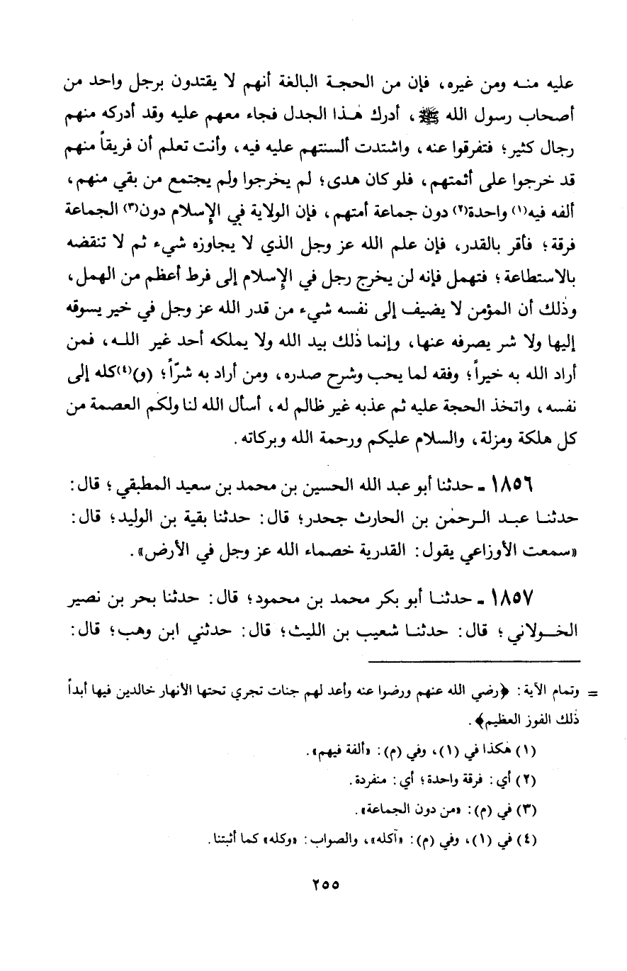 1856 - حَدَّثَنَا أَبُو عَبْدِ اللَّهِ الْحُسَيْنُ بْنُ مُحَمَّدِ بْنِ سَعِيدٍ الْمَطْبَقِيُّ، قَالَ: حَدَّثَنَا عَبْدُ الرَّحْمَنِ بْنُ الْحَارِثِ جَحْدَرٌ، قَالَ: حَدَّثَنَا بَقِيَّةُ بْنُ الْوَلِيدِ، قَالَ: سَمِعْتُ الْأَوْزَاعِيَّ، يَقُولُ: § «الْقَدَرِيَّةُ خُصَمَاءُ اللَّهِ عَزَّ وَجَلَّ فِي الْأَرْضِ»