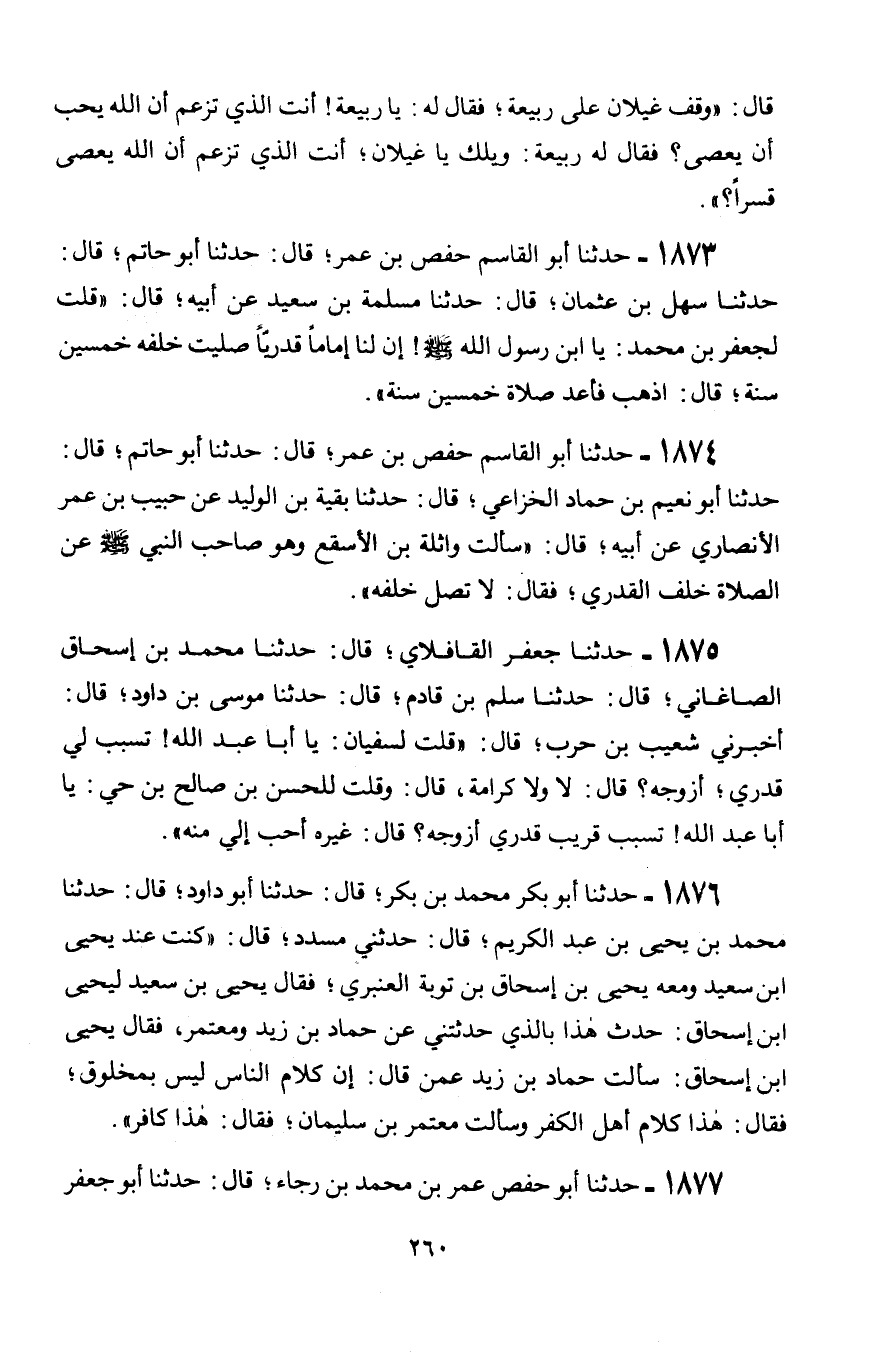 1873 - حَدَّثَنَا أَبُو الْقَاسِمِ حَفْصُ بْنُ عُمَرَ قَالَ: حَدَّثَنَا أَبُو حَاتِمٍ، قَالَ: حَدَّثَنَا سَهْلُ بْنُ عُثْمَانَ، قَالَ: حَدَّثَنَا مَسْلَمَةُ بْنُ سَعِيدٍ، عَنْ أَبِيهِ، قَالَ: قُلْتُ لِجَعْفَرِ بْنِ مُحَمَّدٍ: يَا ابْنَ رَسُولِ اللَّهِ صَلَّى اللَّهُ عَلَيْهِ وَسَلَّمَ، إِنَّ " §لَنَا إِمَامًا قَدَرِيًّا صَلَّيْتُ خَلْفَهُ خَمْسِينَ سَنَةً قَالَ: اذْهَبْ فَأَعِدْ صَلَاةَ خَمْسِينَ سَنَةً "