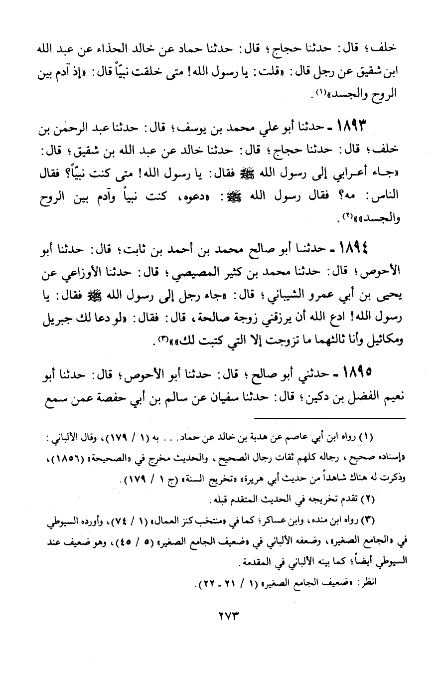 1893 - حَدَّثَنَا أَبُو عَلِيٍّ مُحَمَّدُ بْنُ يُوسُفَ قَالَ: حَدَّثَنَا عَبْدُ الرَّحْمَنِ بْنُ خَلَفٍ، قَالَ: حَدَّثَنَا حَجَّاجٌ، قَالَ: حَدَّثَنَا خَالِدٌ، عَنْ عَبْدِ اللَّهِ بْنِ شَقِيقٍ، قَالَ: " جَاءَ أَعْرَابِيٌّ إِلَى رَسُولِ اللَّهِ صَلَّى اللَّهُ عَلَيْهِ وَسَلَّمَ , فَقَالَ: يَا رَسُولَ اللَّهِ، مَتَى كُنْتَ نَبِيًّا؟ فَقَالَ النَّاسُ: مَهْ فَقَالَ رَسُولُ اللَّهِ صَلَّى اللَّهُ عَلَيْهِ وَسَلَّمَ: «§دَعُوهُ، كُنْتُ نَبِيًّا وَآدَمُ بَيْنَ الرُّوحِ وَالْجَسَدِ»