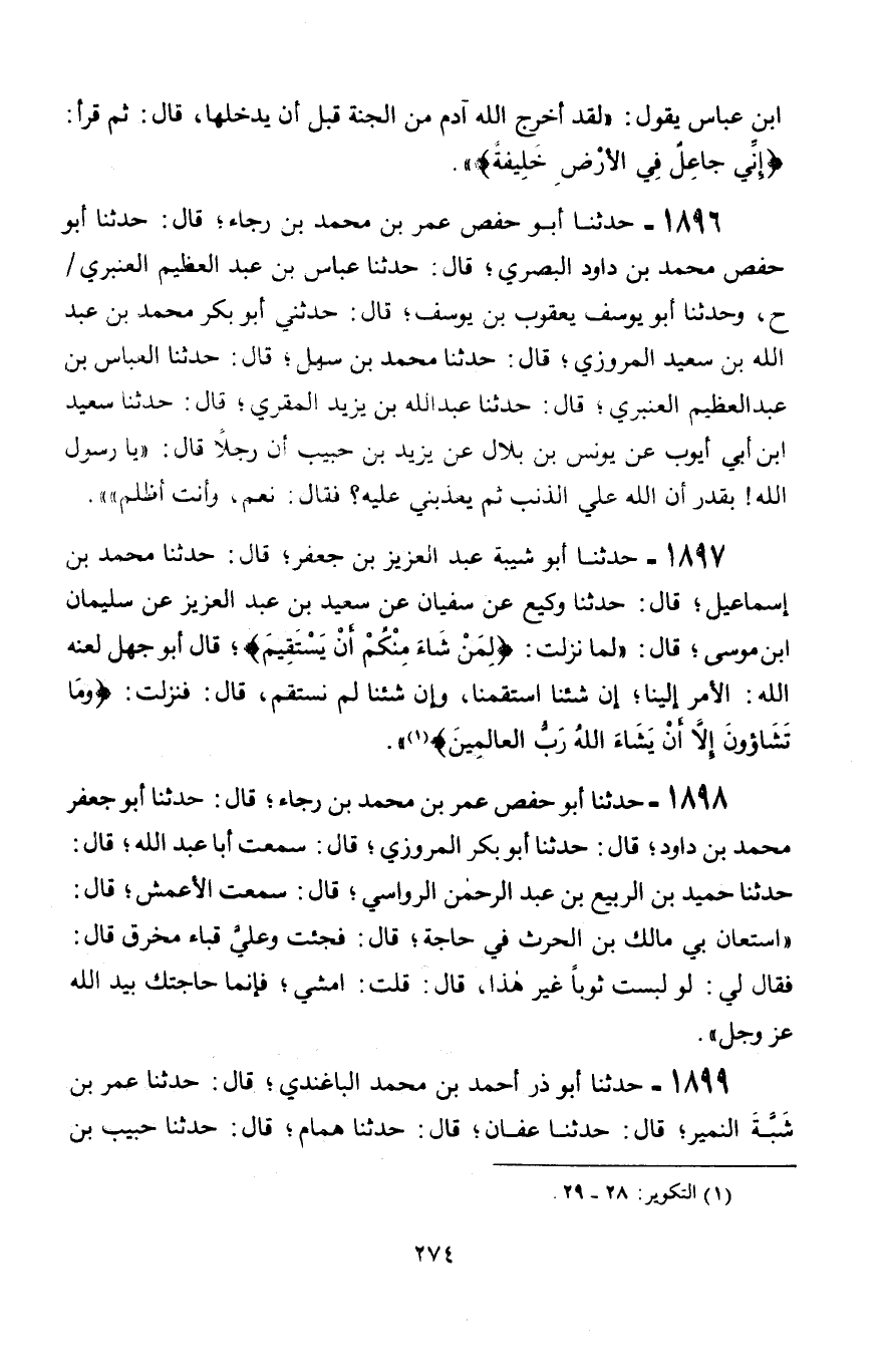 1897 - حَدَّثَنَا أَبُو شَيْبَةَ عَبْدُ الْعَزِيزِ بْنُ جَعْفَرٍ، قَالَ: حَدَّثَنَا مُحَمَّدُ بْنُ إِسْمَاعِيلَ، قَالَ: حَدَّثَنَا وَكِيعٌ، عَنْ سُفْيَانَ، عَنْ سَعِيدِ بْنِ عَبْدِ الْعَزِيزِ، عَنْ سُلَيْمَانَ بْنِ مُوسَى، قَالَ: " §لَمَّا نَزَلَتْ {لِمَنْ شَاءَ مِنْكُمْ أَنْ يَسْتَقِيمَ} [التكوير: 28]، قَالَ أَبُو جَهْلٍ لَعَنَهُ اللَّهُ: الْأَمْرُ إِلَيْنَا، إِنْ شِئْنَا اسْتَقَمْنَا، وَإِنْ شِئْنَا لَمْ نَسْتَقِمْ قَالَ: فَنَزَلَتْ {وَمَا تَشَاءُونَ إِلَّا أَنْ يَشَاءَ اللَّهُ رَبُّ الْعَالَمِينَ}