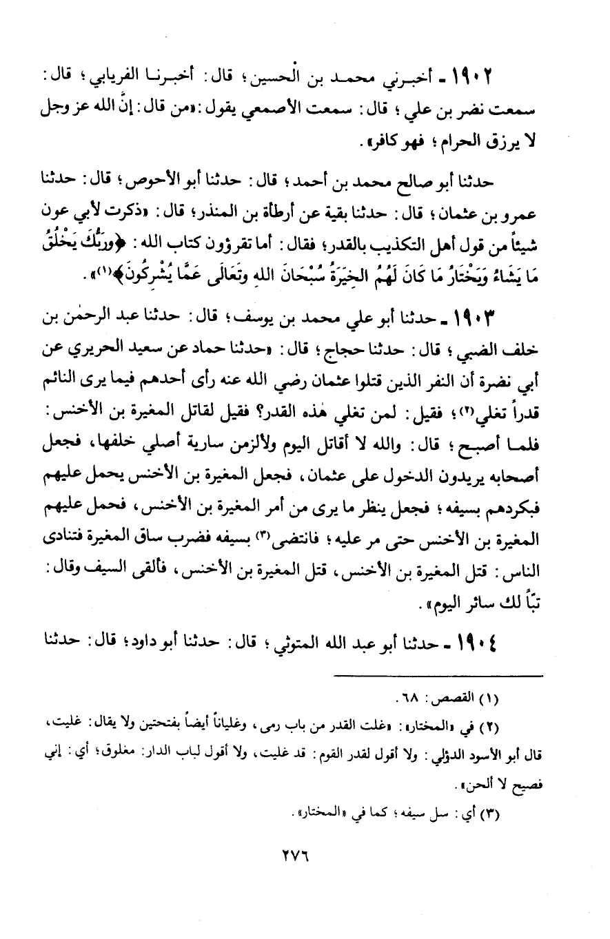 1903 - حَدَّثَنَا أَبُو عَلِيٍّ مُحَمَّدُ بْنُ يُوسُفَ قَالَ: حَدَّثَنَا عَبْدُ الرَّحْمَنِ بْنُ خَلَفٍ الضَّبِّيُّ، قَالَ: حَدَّثَنَا حَجَّاجٌ، قَالَ: حَدَّثَنَا حَمَّادٌ، عَنْ سَعِيدٍ الْجُرَيْرِيِّ، عَنْ أَبِي نَضْرَةَ أَنَّ §" النَّفَرَ الَّذِينَ قَتَلُوا عُثْمَانَ رَضِيَ اللَّهُ عَنْهُ رَأَى أَحَدُهُمْ فِيمَا يَرَى النَّائِمُ قِدْرًا تَغْلِي، فَقِيلَ: لِمَنْ تَغْلِي هَذِهِ الْقِدْرُ؟ فَقِيلَ: لِقَاتِلِ الْمُغِيرَةِ بْنِ الْأَخْنَسِ: فَلَمَّا أَصْبَحَ قَالَ: وَاللَّهِ لَا أُقَاتِلُ الْيَوْمَ وَلَأَلْزَمَنَّ سَارِيَةً أُصَلِّي خَلْفَهَا، فَجَعَلَ أَصْحَابُهُ يُرِيدُونَ الدُّخُولَ عَلَى عُثْمَانَ، فَجَعَلَ الْمُغِيرَةُ بْنُ الْأَخْنَسِ يَحْمِلُ عَلَيْهِمْ فَبَكْرَدَهُمْ بِسَيْفِهِ، فَجَعَلَ يَنْظُرُ مَا يَرَى مِنْ أَمْرِ الْمُغِيرَةِ بْنِ الْأَخْنَسِ، فَحَمَلَ عَلَيْهِمُ الْمُغِيرَةُ بْنُ الْأَخْنَسِ، حَتَّى مَرَّ عَلَيْهِ، فَانْتَضَى بِسَيْفِهِ فَضَرَبَ سَاقَ الْمُغِيرَةِ، فَتَنَادَى النَّاسُ: قُتِلَ الْمُغِيرَةُ بْنُ الْأَخْنَسِ، قُتِلَ الْمُغِيرَةُ بْنُ الْأَخْنَسِ، فَأَلْقَى السَّيْفَ وَقَالَ: تَبًّا لَكَ سَائِرَ الْيَوْمِ "