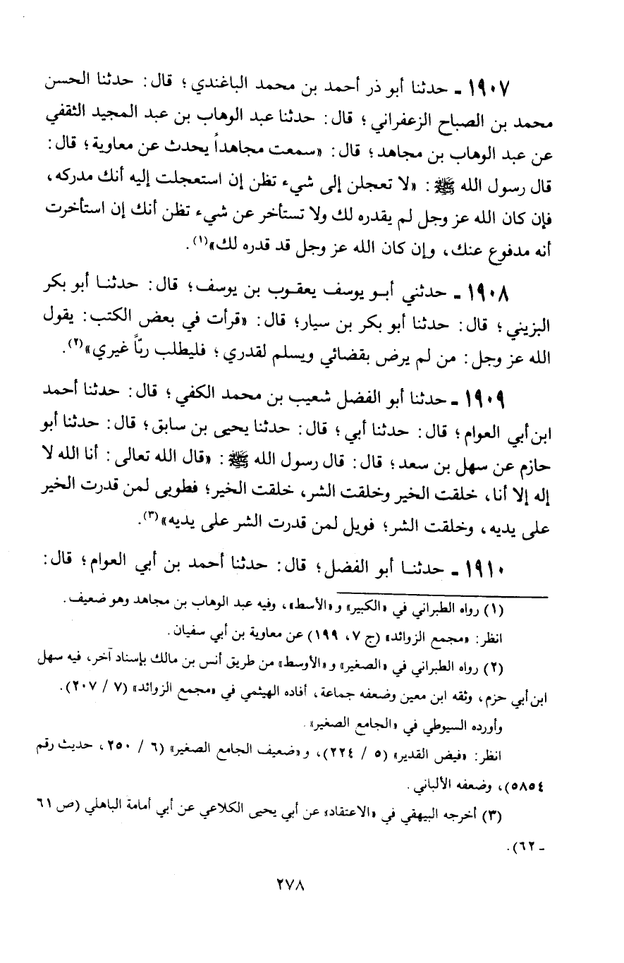 1909 - حَدَّثَنَا أَبُو الْفَضْلِ شُعَيْبُ بْنُ مُحَمَّدٍ الْكَفِّيُّ، قَالَ: حَدَّثَنَا أَحْمَدُ بْنُ أَبِي الْعَوَّامِ، قَالَ: حَدَّثَنَا أبي قَالَ: حَدَّثَنَا يَحْيَى بْنُ سَابِقٍ، قَالَ: حَدَّثَنَا أَبُو حَازِمٍ، عَنْ سَهْلِ بْنِ سَعْدٍ، قَالَ: قَالَ رَسُولُ اللَّهِ صَلَّى اللَّهُ عَلَيْهِ وَسَلَّمَ: " قَالَ اللَّهُ تَعَالَى: «§أَنَا اللَّهُ، لَا إِلَهَ إِلَّا أَنَا، خَلَقْتُ الْخَيْرَ، وَخَلَقْتُ الشَّرَّ، خَلَقْتُ الْخَيْرَ، فَطُوبَى لِمَنْ قَدَّرْتُ الْخَيْرَ عَلَى يَدَيْهِ، وَخَلَقْتُ الشَّرَّ، فَوَيْلٌ لِمَنْ قَدَّرْتُ الشَّرَّ عَلَى يَدَيْهِ»