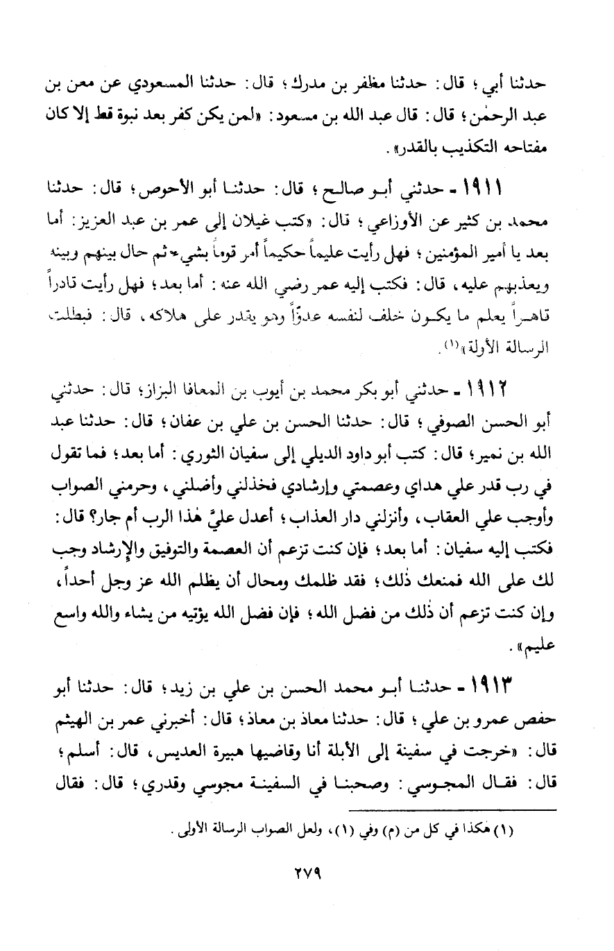 1912 - حَدَّثَنِي أَبُو بَكْرٍ مُحَمَّدُ بْنُ أَيُّوبَ بْنِ الْمُعَافَى الْبَزَّازُ قَالَ: حَدَّثَنِي أَبُو الْحَسَنِ الصُّوفِيُّ، قَالَ: حَدَّثَنَا الْحَسَنُ بْنُ عَلِيِّ بْنِ عَفَّانَ، قَالَ: حَدَّثَنَا عَبْدُ اللَّهِ بْنُ نُمَيْرٍ، قَالَ: كَتَبَ أَبُو دَاوُدَ الدِّيلِيُّ إِلَى سُفْيَانَ الثَّوْرِيِّ: أَمَّا بَعْدُ، فَمَا تَقُولُ فِي رَبٍّ قَدَّرَ عَلَيَّ هُدَايَ وَعِصْمَتِي وَإِرْشَادِي فَخَذَلَنِي وَأَضَلَّنِي، وَحَرَمَنِي الصَّوَابَ وَأَوْجَبَ عَلَيَّ الْعِقَابَ، وَأَنْزَلَنِي دَارَ الْعَذَابِ، أَعَدَلَ عَلَيَّ هَذَا الرَّبُّ أَمْ جَارَ؟ قَالَ: فَكَتَبَ إِلَيْهِ سُفْيَانُ: أَمَّا بَعْدُ، § «فَإِنْ كُنْتَ تَزْعُمُ أَنَّ الْعِصْمَةَ وَالتَّوْفِيقَ وَالْإِرْشَادَ وَجَبَ لَكَ عَلَى اللَّهِ فَمَنَعَكَ ذَلِكَ، فَقَدْ ظَلَمَكَ وَمُحَالٌ أَنْ يَظْلِمَ اللَّهُ عَزَّ وَجَلَّ أَحَدًا، وَإِنْ كُنْتَ تَزْعُمُ أَنَّ ذَلِكَ مِنْ فَضْلِ اللَّهِ، فَإِنَّ فَضْلَ اللَّهِ يُؤْتِيهِ مَنْ يَشَاءُ وَاللَّهُ وَاسِعٌ عَلِيمٌ»