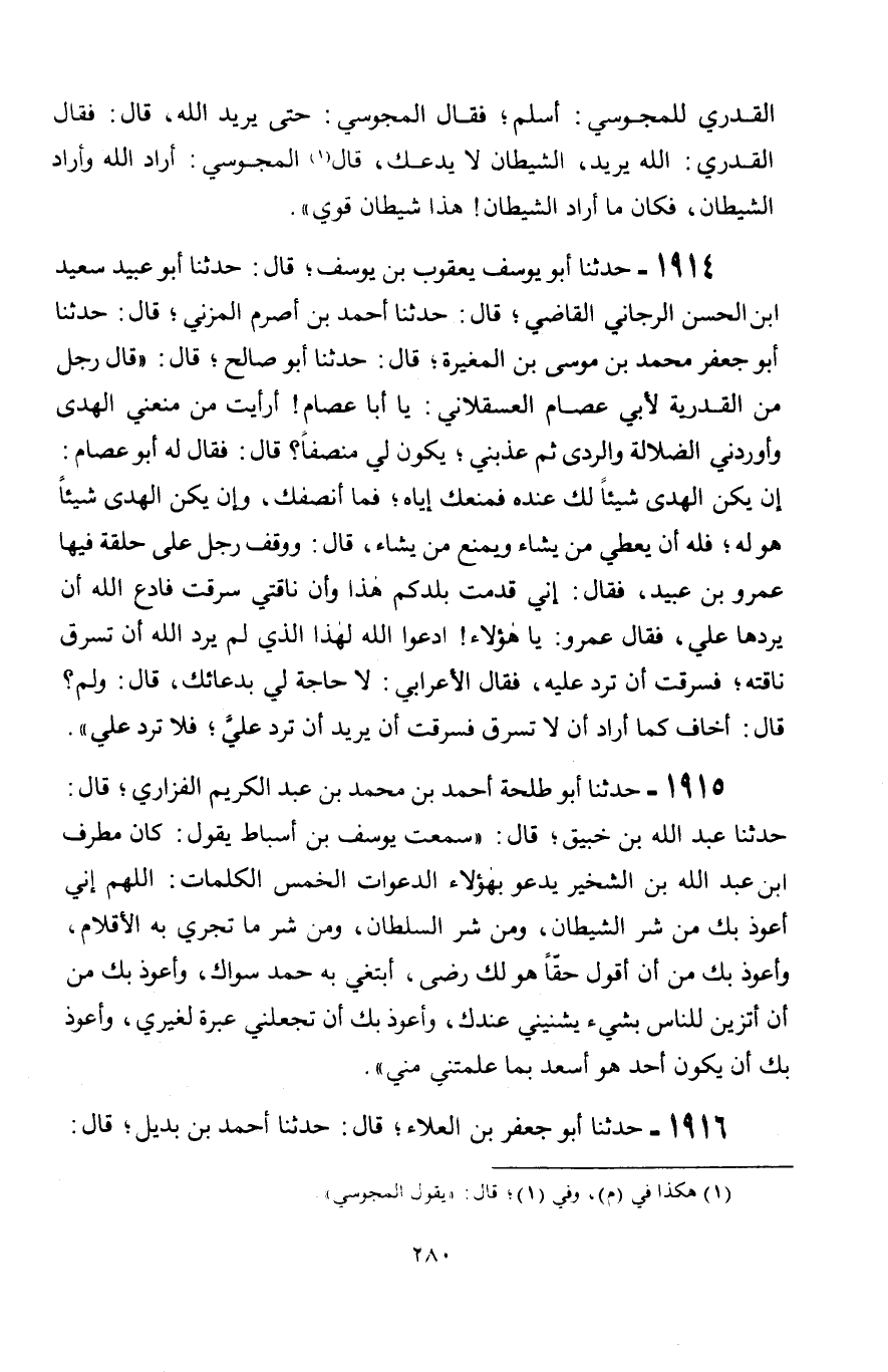 1914 - حَدَّثَنَا أَبُو يُوسُفَ يَعْقُوبُ بْنُ يُوسُفَ قَالَ: حَدَّثَنَا أَبُو عُبَيْدٍ سَعِيدُ بْنُ الْحَسَنِ الرَّجَّانِيُّ الْقَاضِي قَالَ: حَدَّثَنَا أَحْمَدُ بْنُ أَصْرَمَ الْمُزَنِيُّ، قَالَ: حَدَّثَنَا أَبُو جَعْفَرٍ مُحَمَّدُ بْنُ مُوسَى بْنِ الْمُغِيرَةِ قَالَ: حَدَّثَنَا أَبُو صَالِحٍ، قَالَ: قَالَ رَجُلٌ مِنَ الْقَدَرِيَّةِ لِأَبِي عِصَامٍ الْعَسْقَلَانِيِّ: يَا أَبَا عِصَامٍ أَرَأَيْتَ مَنْ مَنَعَنِي الْهُدَى وَأَوْرَدَنِي الضَّلَالَةَ وَالرَّدَى ثُمَّ عَذَّبَنِي، يَكُونُ لِي مُنْصِفًا؟ قَالَ: فَقَالَ لَهُ أَبُو عِصَامٍ: " §إِنْ يَكُنِ الْهُدَى شَيْئًا لَكَ عِنْدَهُ فَمَنَعَكَ إِيَّاهُ، فَمَا أَنْصَفَكَ، وَإِنَّ يَكُنِ الْهُدَى شَيْئًا هُوَ لَهُ، فَلَهُ أَنْ يُعْطِيَ مَنْ يَشَاءُ وَيَمْنَعَ مَنْ يَشَاءُ قَالَ: وَوَقَفَ رَجُلٌ عَلَى حَلْقَةٍ فِيهَا عَمْرُو بْنُ عُبَيْدٍ، فَقَالَ: إِنِّي قَدِمْتُ بَلَدَكُمْ هَذَا وَإِنَّ نَاقَتِي سُرِقَتْ، فَادْعُ اللَّهَ أَنْ يَرُدَّهَا عَلَيَّ، فَقَالَ عَمْرٌو: يَا هَؤُلَاءِ ادْعُوا اللَّهَ لِهَذَا الَّذِي لَمْ يُرِدِ اللَّهُ أَنْ تُسْرَقَ نَاقَتُهُ، فَسُرِقَتْ أَنْ تُرَدَّ عَلَيْهِ، فَقَالَ الْأَعْرَابِيُّ: لَا حَاجَةَ لِي بِدُعَائِكَ قَالَ: وَلِمَ؟ قَالَ: أَخَافُ كَمَا أَرَادَ أَنْ لَا تُسْرَقَ فَسُرِقَتْ أَنْ يُرِيدَ أَنْ تُرَدَّ عَلَيَّ، فَلَا تُرَدُّ عَلَيَّ "