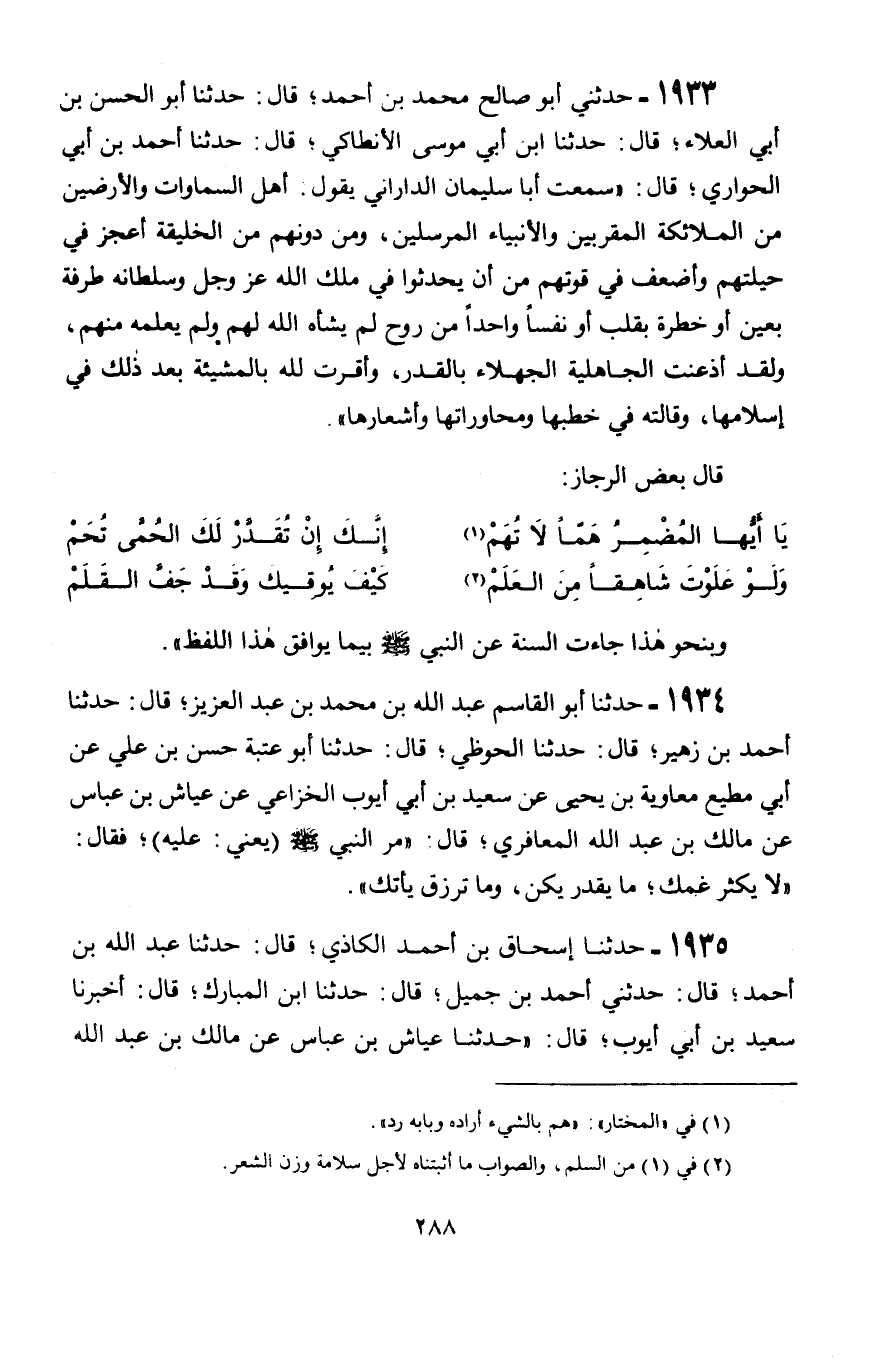 1933 - حَدَّثَنِي أَبُو صَالِحٍ مُحَمَّدُ بْنُ أَحْمَدَ قَالَ: حَدَّثَنَا أَبُو الْحَسَنِ بْنُ أَبِي الْعَلَاءِ، قَالَ: حَدَّثَنَا ابْنُ أَبِي مُوسَى الْأَنْطَاكِيُّ قَالَ: حَدَّثَنَا أَحْمَدُ بْنُ أَبِي الْحَوَارِيِّ، قَالَ: سَمِعْتُ أَبَا سُلَيْمَانَ الدَّارَانِيَّ، يَقُولُ: §أَهْلُ السَّمَاوَاتِ وَالْأَرَضِينَ مِنَ الْمَلَائِكَةِ الْمُقَرَّبِينَ وَالْأَنْبِيَاءِ الْمُرْسَلِينَ، وَمَنْ دُونَهُمْ مِنَ الْخَلِيقَةِ أَعْجَزُ فِي حِيلَتِهِمْ وَأَضْعَفُ فِي قُوَّتِهِمْ مِنْ أَنْ يُحْدِثُوا فِي مُلْكِ اللَّهِ عَزَّ وَجَلَّ وَسُلْطَانِهِ طَرْفَةً بِعَيْنٍ، أَوْ خَطْرَةً بِقَلْبٍ أَوْ نَفَسًا وَاحِدًا مِنْ رُوحٍ لَمْ يَشَأْهُ اللَّهُ لَهُمْ وَلَمْ يَعْلَمْهُ مِنْهُمْ، وَلَقَدْ أَذْعَنَتِ الْجَاهِلِيَّةُ الْجُهَلَاءُ بِالْقَدَرِ، وَأَقَرَّتْ لِلَّهِ بِالْمَشِيئَةِ بَعْدَ ذَلِكَ فِي إِسْلَامِهَا، وَقَالَتْهُ فِي خُطَبِهَا وَمُحَاوَرَاتِهَا وَأَشْعَارِهَا". قَالَ بَعْضُ الرُّجَّازِ: