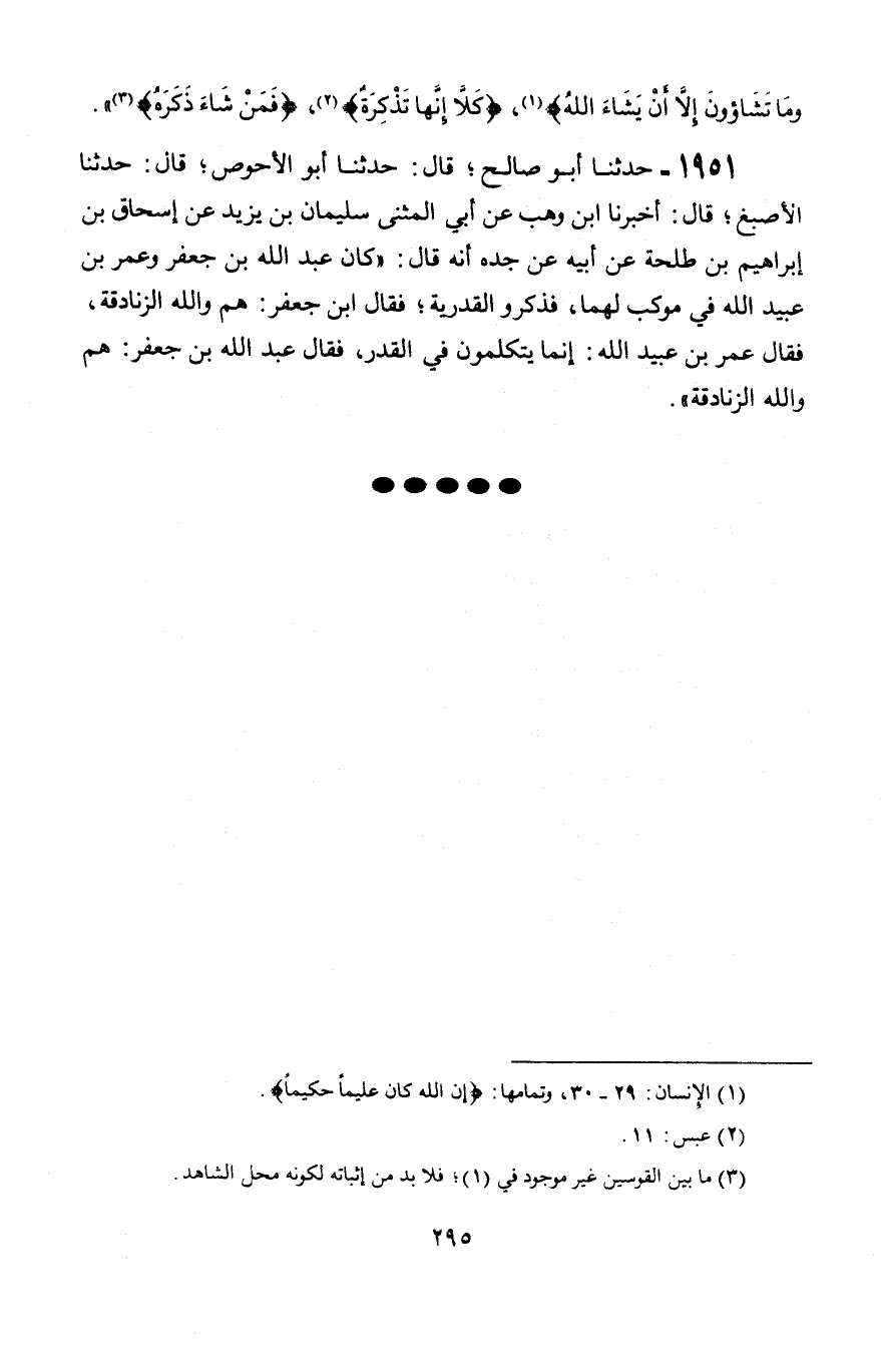 1951 - حَدَّثَنَا أَبُو صَالِحٍ، قَالَ: حَدَّثَنَا أَبُو الْأَحْوَصِ، قَالَ: حَدَّثَنَا الْأَصْبَغُ، قَالَ: أَخْبَرَنَا ابْنُ وَهْبٍ، عَنْ أَبِي الْمُثَنَّى سُلَيْمَانَ بْنِ يَزِيدَ، عَنْ إِسْحَاقَ بْنِ إِبْرَاهِيمَ بْنِ طَلْحَةَ، عَنْ أَبِيهِ، عَنْ جَدِّهِ، أَنَّهُ قَالَ: كَانَ عَبْدُ اللَّهِ بْنُ جَعْفَرٍ وَعُمَرُ بْنُ عُبَيْدِ اللَّهِ فِي مَوْكِبٍ لَهُمَا، " §فَذَكَرُوا الْقَدَرِيَّةَ، فَقَالَ ابْنُ جَعْفَرٍ: هُمْ وَاللَّهِ الزَّنَادِقَةُ، فَقَالَ عُمَرُ بْنُ عُبَيْدِ اللَّهِ: إِنَّمَا يَتَكَلَّمُونَ فِي الْقَدَرِ، فَقَالَ عَبْدُ اللَّهِ بْنُ جَعْفَرٍ: هُمْ وَاللَّهِ الزَّنَادِقَةُ "