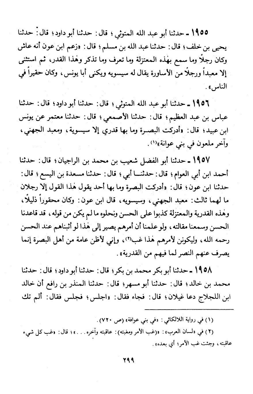 1956 - حَدَّثَنَا أَبُو عَبْدِ اللَّهِ الْمَتُّوثِيُّ، قَالَ: حَدَّثَنَا أَبُو دَاوُدَ، قَالَ: حَدَّثَنَا عَبَّاسُ بْنُ عَبْدِ الْعَظِيمِ، قَالَ: حَدَّثَنَا الْأَصْمَعِيُّ، قَالَ: حَدَّثَنَا مُعْتَمِرٌ، عَنْ يُونُسَ بْنِ عُبَيْدٍ، قَالَ: «§أَدْرَكْتُ الْبَصْرَةَ وَمَا بِهَا قَدَرِيٌّ إِلَّا سِيسَوَيْهِ، وَمَعْبَدٌ الْجُهَنِيُّ، وَآخَرُ مَلْعُونٌ فِي بَنِي عَوَانَةَ»