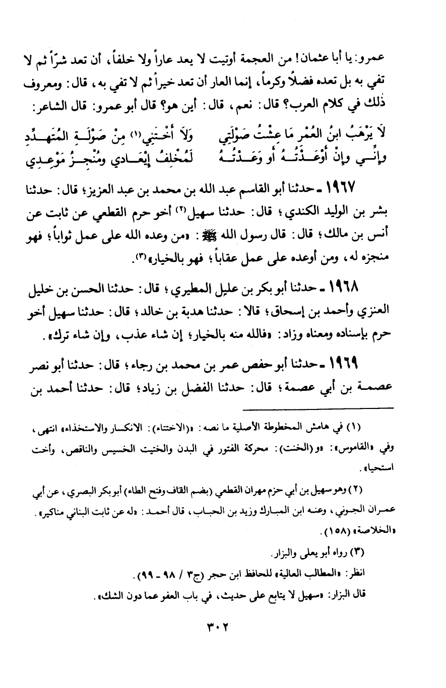 1969 - حَدَّثَنَا أَبُو حَفْصٍ عُمَرُ بْنُ مُحَمَّدِ بْنِ رَجَاءٍ قَالَ: حَدَّثَنَا أَبُو نَصْرٍ عِصْمَةُ بْنُ أَبِي عِصْمَةَ قَالَ: حَدَّثَنَا الْفَضْلُ بْنُ زِيَادٍ، قَالَ: حَدَّثَنَا أَحْمَدُ بْنُ -[303]- حَنْبَلٍ، قَالَ: حَدَّثَنَا مُعَاذٌ يَعْنِي ابْنَ مُعَاذٍ قَالَ: كُنْتُ عِنْدَ عَمْرِو بْنِ عُبَيْدٍ، فَجَاءَ عُثْمَانُ بْنُ خَاشٍ، وَهُوَ أَخُو السَّمُرِيِّ، فَقَالَ: يَا أَبَا عُثْمَانَ سَمِعْتُ وَاللَّهِ الْيَوْمَ الْكُفْرَ، قَالَ: مَا هُوَ؟ لَا تَعْجَلْ بِالْكُفْرِ، قَالَ: هَاشِمٌ الْأَوْقَصُ §زَعَمَ أَنَّ {تَبَّتْ يَدَا أَبِي لَهَبٍ} [المسد: 1]، وَقَوْلَ اللَّهِ: {ذَرْنِي وَمَنْ خَلَقْتُ وَحِيدًا} [المدثر: 11] لَمْ يَكُنْ هَذَا فِي أُمِّ الْكِتَابِ، وَاللَّهُ عَزَّ وَجَلَّ يَقُولُ {حم وَالْكِتَابِ الْمُبِينِ إِنَّا جَعَلْنَاهُ قُرْآنًا عَرَبِيًّا لَعَلَّكُمْ تَعْقِلُونَ وَإِنَّهُ فِي أُمِّ الْكِتَابِ لَدَيْنَا لَعَلِيٌّ حَكِيمٌ} [الزخرف: 2]، فَمَا الْكُفْرُ إِلَّا هَذَا، فَسَكَتَ عَمْرٌو سَاعَةً ثُمَّ تَكَلَّمَ، فَقَالَ: وَاللَّهِ لَوْ كَانَ الْأَمْرُ كَمَا تَقُولُ مَا كَانَ عَلَى أَبِي لَهَبٍ مِنْ لَوْمٍ، وَلَا كَانَ عَلَى الْوَلِيدِ مِنْ لَوْمٍ، قَالَ أَحْمَدُ: «رَحِمَ اللَّهُ مُعَاذًا، أَمْلَاهُ عَلَيْنَا بِالْبَصْرَةِ عَلَى رُءُوسِ النَّاسِ»