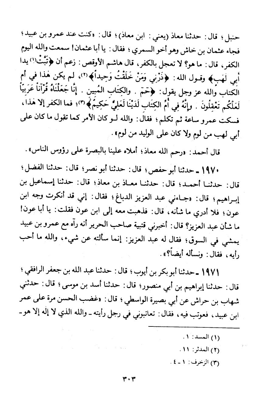 1970 - حَدَّثَنَا أَبُو حَفْصٍ، قَالَ: حَدَّثَنَا أَبُو نَصْرٍ، قَالَ: حَدَّثَنَا الْفَضْلُ، قَالَ: حَدَّثَنَا أَحْمَدُ، قَالَ: حَدَّثَنَا مُعَاذُ بْنُ مُعَاذٍ، قَالَ: حَدَّثَنَا إِسْمَاعِيلُ بْنُ إِبْرَاهِيمَ، قَالَ: " §جَاءَنِي عَبْدُ الْعَزِيزِ الدَّبَّاغُ، فَقَالَ: إِنِّي قَدْ أَنْكَرْتُ وَجْهَ ابْنِ عَوْنٍ، فَلَا أَدْرِي مَا شَأْنُهُ، قَالَ: فَذَهَبْتُ مَعَهُ إِلَى ابْنِ عَوْنٍ، فَقُلْتُ: يَا أَبَا عَوْنٍ مَا شَأْنُ عَبْدِ الْعَزِيزِ؟ قَالَ: أَخْبَرَنِي قُتَبْيَةُ صَاحِبُ الْحَرِيرِ أَنَّهُ رَآهُ مَعَ عَمْرِو بْنِ عُبَيْدٍ يَمْشِي فِي السُّوقِ، فَقَالَ لَهُ عَبْدُ الْعَزِيزِ: إِنَّمَا سَأَلْتُهُ عَنْ شَيْءٍ، وَاللَّهِ مَا أُحِبُّ رَأْيَهُ، فَقَالَ: وَتَسْأَلُهُ أَيْضًا؟ "