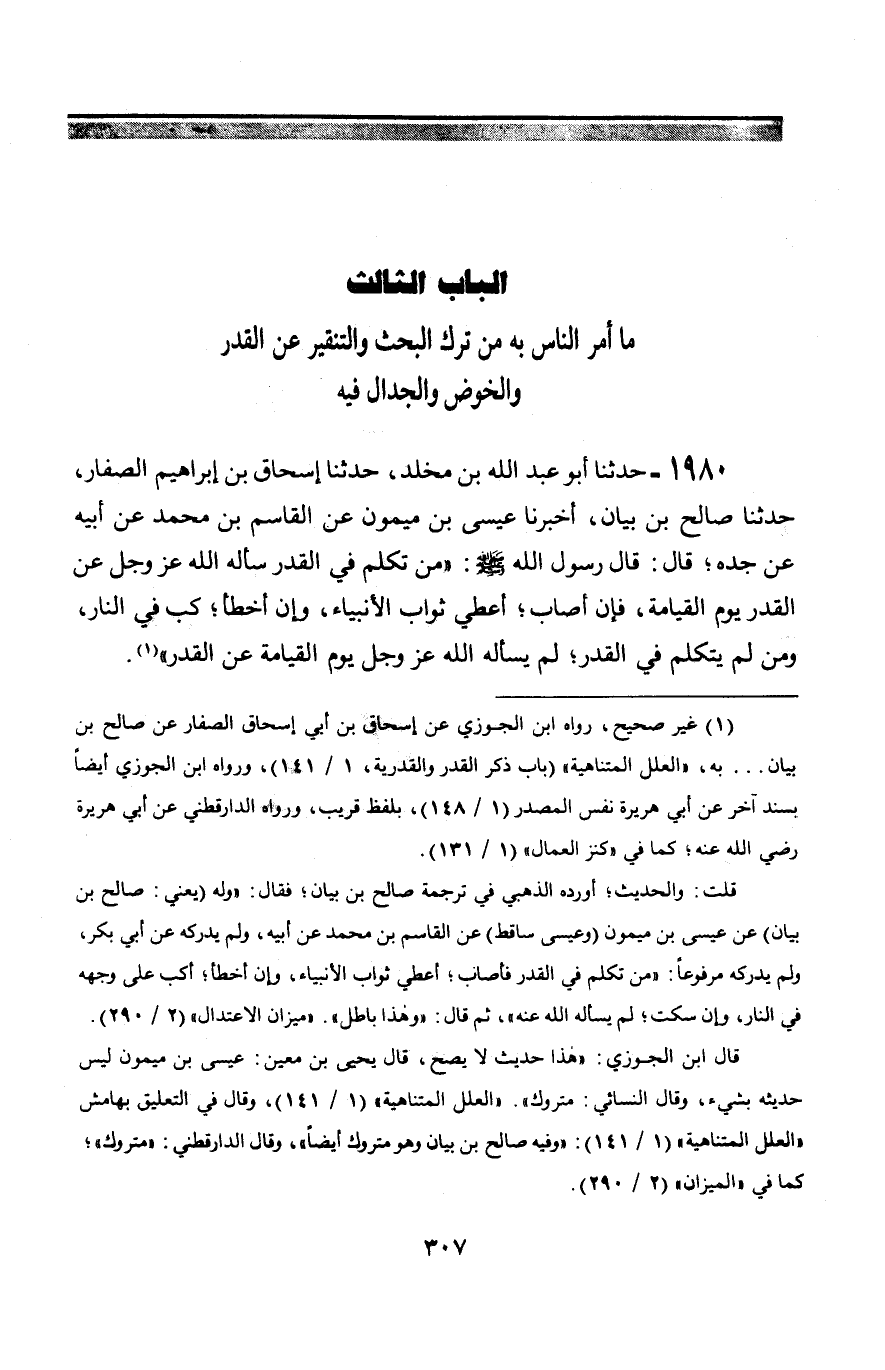 1980 - حَدَّثَنَا أَبُو عَبْدِ اللَّهِ بْنُ مَخْلَدٍ، حَدَّثَنَا إِسْحَاقُ بْنُ إِبْرَاهِيمَ الصَّفَّارُ، حَدَّثَنَا صَالِحُ بْنُ بَيَانٍ، أَخْبَرَنَا عِيسَى بْنُ مَيْمُونٍ، عَنِ الْقَاسِمِ بْنِ مُحَمَّدٍ، عَنْ أَبِيهِ، عَنْ جَدِّهِ، قَالَ: قَالَ رَسُولُ اللَّهِ صَلَّى اللَّهُ عَلَيْهِ وَسَلَّمَ: § «مَنْ تَكَلَّمَ فِي الْقَدَرِ سَأَلَهُ اللَّهُ عَزَّ وَجَلَّ عَنِ الْقَدَرِ يَوْمَ الْقِيَامَةَ، فَإِنْ أَصَابَ أُعْطِيَ ثَوَابَ الْأَنْبِيَاءِ، وَإِنْ أَخْطَأَ كُبَّ فِي النَّارِ، وَمَنْ لَمْ يَتَكَلَّمْ فِي الْقَدَرِ لَمْ يَسْأَلْهُ اللَّهُ عَزَّ وَجَلَّ يَوْمَ الْقِيَامَةِ عَنِ الْقَدَرِ»