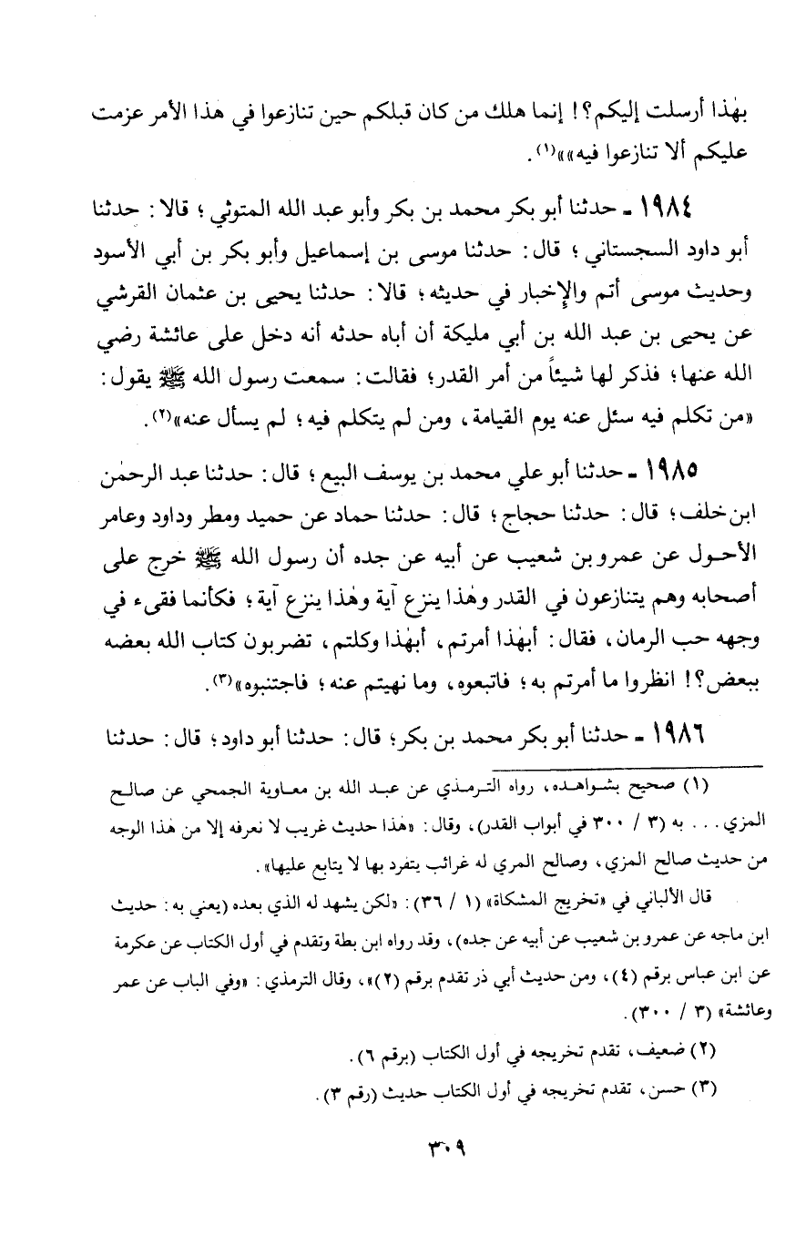 1984 - حَدَّثَنَا أَبُو بَكْرٍ مُحَمَّدُ بْنُ بَكْرٍ، وَأَبُو عَبْدِ اللَّهِ الْمَتُّوثِيُّ قَالَا: حَدَّثَنَا أَبُو دَاوُدَ السِّجِسْتَانِيُّ، قَالَ: حَدَّثَنَا مُوسَى بْنُ إِسْمَاعِيلَ، وَأَبُو بَكْرِ بْنُ أَبِي الْأَسْوَدِ، وَحَدِيثُ مُوسَى أَتَمُّ وَالْإِخْبَارُ فِي حَدِيثِهِ، قَالَا: حَدَّثَنَا يَحْيَى بْنُ عُثْمَانَ الْقُرَشِيُّ، عَنْ يَحْيَى بْنِ عَبْدِ اللَّهِ بْنِ أَبِي مُلَيْكَةَ، أَنَّ أَبَاهُ حَدَّثَهُ، أَنَّهُ دَخَلَ عَلَى عَائِشَةَ رَضِيَ اللَّهُ عَنْهَا فَذَكَرَ لَهَا شَيْئًا مِنْ أَمْرِ الْقَدَرِ، فَقَالَتْ: سَمِعْتُ رَسُولَ اللَّهِ صَلَّى اللَّهُ عَلَيْهِ وَسَلَّمَ يَقُولُ: «§مَنْ تَكَلَّمَ فِيهِ سُئِلَ عَنْهُ يَوْمَ الْقِيَامَةِ، وَمَنْ لَمْ يَتَكَلَّمْ فِيهِ، لَمْ يُسْأَلْ عَنْهُ»
