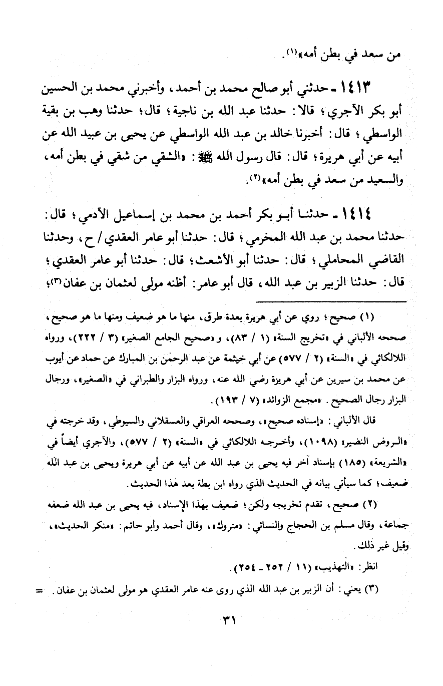 1413 - حَدَّثَنِي أَبُو صَالِحٍ مُحَمَّدُ بْنُ أَحْمَدَ، وَأَخْبَرَنِي مُحَمَّدُ بْنُ الْحُسَيْنِ أَبُو بَكْرٍ الْآجُرِّيُّ، قَالَا: حَدَّثَنَا عَبْدُ اللَّهِ بْنُ نَاجِيَةَ، قَالَ: حَدَّثَنَا وَهْبُ بْنُ بَقِيَّةَ الْوَاسِطِيُّ، قَالَ: أَخْبَرَنَا خَالِدُ بْنُ عَبْدِ اللَّهِ الْوَاسِطِيُّ، عَنْ يَحْيَى بْنِ عُبَيْدِ اللَّهِ، عَنْ أَبِيهِ، عَنْ أَبِي هُرَيْرَةَ، قَالَ: قَالَ رَسُولُ اللَّهِ صَلَّى اللَّهُ عَلَيْهِ وَسَلَّمَ: «§الشَّقِيُّ مَنْ شَقِيَ فِي بَطْنِ أُمِّهِ، وَالسَّعِيدُ مَنْ سَعِدَ فِي بَطْنِ أُمِّهِ»