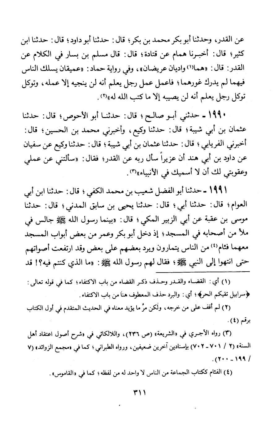 1991 - حَدَّثَنَا أَبُو الْفَضْلِ شُعَيْبُ بْنُ مُحَمَّدٍ الْكَفِّيُّ قَالَ: حَدَّثَنَا ابْنُ أَبِي الْعَوَّامِ، قَالَ: حَدَّثَنَا أَبِي، قَالَ: حَدَّثَنَا يَحْيَى بْنُ سَابِقٍ الْمَدَنِيُّ، قَالَ: حَدَّثَنَا مُوسَى بْنُ عُقْبَةَ، عَنْ أَبِي الزُّبَيْرِ الْمَكِّيِّ، قَالَ: " بَيْنَمَا رَسُولُ اللَّهِ صَلَّى اللَّهُ عَلَيْهِ وَسَلَّمَ جَالِسٌ فِي مَلَأٍ مِنْ أَصْحَابِهِ فِي الْمَسْجِدِ، إِذْ دَخَلَ أَبُو بَكْرٍ وَعُمَرُ مِنْ بَعْضِ أَبْوَابِ الْمَسْجِدِ مَعَهُمَا فِئَامٌ مِنَ النَّاسِ يَتَمَارَوْنَ وَيَرُدُّ بَعْضُهُمْ عَلَى بَعْضٍ، وَقَدِ ارْتَفَعَتْ أَصْوَاتُهُمْ حَتَّى انْتَهَوْا إِلَى النَّبِيِّ صَلَّى اللَّهُ عَلَيْهِ وَسَلَّمَ، فَقَالَ لَهُمْ رَسُولُ اللَّهِ صَلَّى اللَّهُ عَلَيْهِ وَسَلَّمَ: § «مَا الَّذِي كُنْتُمْ فِيهِ؟ قَدِ -[312]- ارْتَفَعَتْ أَصْوَاتُكُمْ وَكَثُرَ لَغَطُكُمْ»، فَقَالَ بَعْضُ الْقَوْمِ: شَيْءٌ تَكَلَّمَ أَبُو بَكْرٍ وَعُمَرُ فِيهِ يَا رَسُولَ اللَّهِ، فَاخْتَلَفْنَا لِاخْتِلَافِهِمَا، فَقَالَ: وَمَا ذَاكَ؟ قَالُوا: تَكَلَّمَا فِي الْقَدَرِ، فَقَالَ أَبُو بَكْرٍ: يُقَدِّرُ اللَّهُ الْخَيْرَ وَلَا يُقَدِّرُ الشَّرَّ، وَقَالَ عُمَرُ: بَلْ يُقَدِّرُهُمَا جَمِيعًا اللَّهُ، فَقَالَ بَعْضُنَا مَقَالَةَ أَبِي بَكْرٍ، وَقَالَ بَعْضُنَا مَقَالَةَ عُمَرَ، فَكُنَّا فِي هَذَا حَتَّى انْتَهَيْنَا إِلَيْكَ، قَالَ: فَقَالَ رَسُولُ اللَّهِ صَلَّى اللَّهُ عَلَيْهِ وَسَلَّمَ: «أَفَلَا أَقْضِي بَيْنَكُمَا قَضَاءَ إِسْرَافِيلَ بَيْنَ جِبْرِيلَ وَمِيكَائِيلَ»؟ قَالَ: فَقَالَ بَعْضُ الْقَوْمِ: وَقَدْ تَكَلَّمَ فِي هَذَا جِبْرِيلُ وَمِيكَائِيلُ يَا رَسُولَ اللَّهِ؟ قَالَ: " نَعَمْ، وَالَّذِي بَعَثَنِي بِالْحَقِّ، إِنَّهُمَا لَأَوَّلُ الْخَلْقِ تَكَلَّمَا فِيهِ، فَقَالَ جِبْرِيلُ بِمَقَالَةِ عُمَرَ، وَقَالَ مِيكَائِيلُ بِمَقَالَةِ أَبِي بَكْرٍ، فَقَالَ جِبْرِيلُ: إِنَّا إِنِ اخْتَلَفْنَا اخْتَلَفَ أَهْلُ السَّمَاوَاتِ، فَهَلْ لَكَ فِي قَاضٍ بَيْنِي وَبَيْنَكَ؟ فَتَحَاكَمَا إِلَى إِسْرَافِيلَ، فَقَضَى بَيْنَهُمَا بِقَضَاءٍ هُوَ قَضَائِي بَيْنَكُمَا "، قَالُوا: وَمَا كَانَ مِنْ قَضَائِهِ يَا رَسُولَ اللَّهِ؟ قَالَ: «أَوْجَبَ الْقَدَرَ خَيْرَهُ وَشَرَّهُ، ضَرَّهُ وَنَفْعَهُ، حُلْوَهُ وَمُرَّهُ مِنَ اللَّهِ عَزَّ وَجَلَّ، فَهَذَا قَضَائِي بَيْنَكُمَا»، ثُمَّ ضَرَبَ فَخِذَ أَبِي بَكْرٍ، أَوْ عَلَى كَتِفِهِ - وَكَانَ إِلَى جَانِبِهِ - فَقَالَ: «يَا أَبَا بَكْرٍ إِنَّ اللَّهَ عَزَّ وَجَلَّ لَوْ لَمْ يَشَأْ أَنْ يُعْصَى مَا خَلَقَ إِبْلِيسَ»، فَقَالَ أَبُو بَكْرٍ رَضِيَ اللَّهُ عَنْهُ: كَانَتْ مِنِّي هَفْوَةً وَزَلَّةً، أَسْتَغْفِرُ اللَّهَ يَا رَسُولَ اللَّهِ، لَا أَعُودُ لِشَيْءٍ مِنْ هَذَا الْمَنْطِقِ أَبَدًا، قَالَ: فَمَا عَادَ حَتَّى لَقِيَ اللَّهَ، رَحْمَةُ اللَّهِ عَلَيْهِ وَرِضْوَانُهُ "