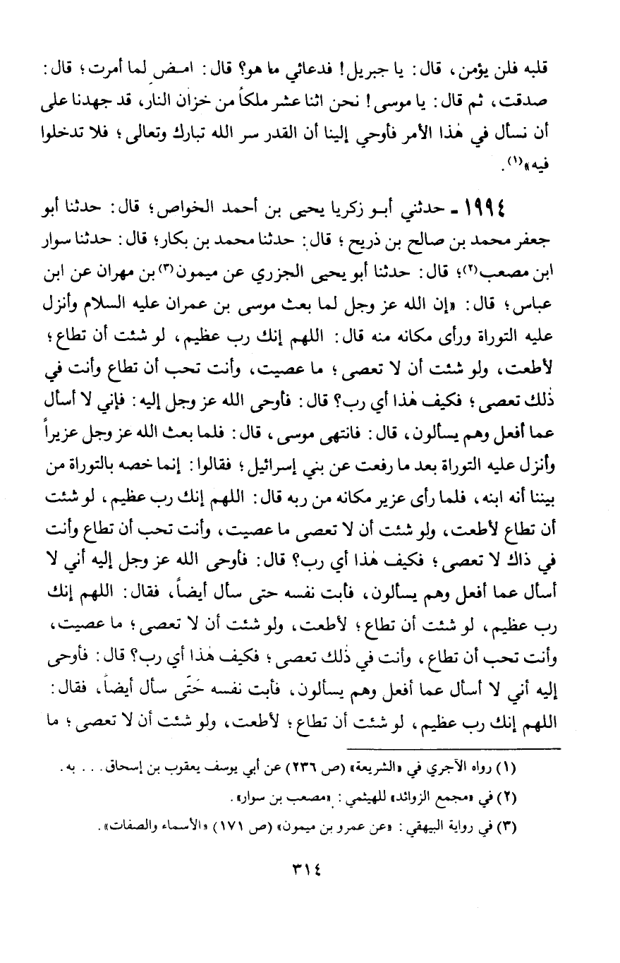 1994 - حَدَّثَنِي أَبُو زَكَرِيَّا يَحْيَى بْنُ أَحْمَدَ الْخَوَّاصُ قَالَ: حَدَّثَنَا أَبُو جَعْفَرٍ مُحَمَّدُ بْنُ صَالِحِ بْنِ ذَرِيحٍ قَالَ: حَدَّثَنَا مُحَمَّدُ بْنُ بَكَّارٍ، قَالَ: حَدَّثَنَا سَوَّارُ بْنُ مُصْعَبٍ، قَالَ: حَدَّثَنَا أَبُو يَحْيَى الْجَزَرِيُّ، عَنْ مَيْمُونِ بْنِ مِهْرَانَ، عَنِ ابْنِ عَبَّاسٍ، قَالَ: " إِنَّ اللَّهَ عَزَّ وَجَلَّ لَمَّا بَعَثَ مُوسَى بْنَ عِمْرَانَ عَلَيْهِ السَّلَامُ، وَأَنْزَلَ عَلَيْهِ التَّوْرَاةَ وَرَأَى مَكَانَهُ مِنْهُ قَالَ: اللَّهُمَّ إِنَّكَ رَبٌّ عَظِيمٌ، لَوْ شِئْتَ أَنْ تُطَاعَ لَأُطِعْتَ، وَلَوْ شِئْتَ أَنْ لَا تُعْصَى مَا عُصِيتَ، وَأَنْتَ تُحِبُّ أَنْ تُطَاعَ وَأَنْتَ فِي ذَلِكَ تُعْصَى، فَكَيْفَ هَذَا أَيْ رَبِّ؟ قَالَ: فَأَوْحَى اللَّهُ عَزَّ وَجَلَّ إِلَيْهِ: فَإِنِّي لَا أُسْأَلُ عَمَّا أَفْعَلُ وَهُمْ يُسْأَلُونَ قَالَ: فَانْتَهَى مُوسَى، قَالَ: فَلَمَّا بَعَثَ اللَّهُ عَزَّ وَجَلَّ عُزَيْرًا وَأَنْزَلَ عَلَيْهِ التَّوْرَاةَ بَعْدَمَا رُفِعَتْ عَنْ بَنِي إِسْرَائِيلَ، فَقَالُوا: إِنَّمَا خَصَّهُ بِالتَّوْرَاةِ مِنْ بَيْنِنَا أَنَّهُ ابْنُهُ، فَلَمَّا رَأَى عُزَيْرٌ مَكَانَهُ مِنْ رَبِّهِ قَالَ: اللَّهُمَّ إِنَّكَ رَبٌّ عَظِيمٌ، لَوْ شِئْتَ أَنْ تُطَاعَ لَأُطِعْتَ، وَلَوْ شِئْتَ أَنْ لَا تُعْصَى مَا عُصِيتَ، وَأَنْتَ تُحِبُّ أَنْ تُطَاعَ وَأَنْتَ فِي ذَلِكَ تُعْصَى، فَكَيْفَ هَذَا أَيْ رَبِّ؟ قَالَ: فَأَوْحَى اللَّهُ عَزَّ وَجَلَّ إِلَيْهِ أَنِّي لَا أُسْأَلُ عَمَّا أَفْعَلُ وَهُمْ يُسْأَلُونَ، فَأَبَتْ نَفْسُهُ حَتَّى سَأَلَ أَيْضًا، فَقَالَ: اللَّهُمَّ إِنَّكَ رَبٌّ عَظِيمٌ، لَوْ شِئْتَ أَنْ تُطَاعَ لَأُطِعْتَ، وَلَوْ شِئْتَ أَنْ لَا تُعْصَى مَا عُصِيتَ، وَأَنْتَ تُحِبُّ أَنْ تُطَاعَ وَأَنْتَ فِي ذَلِكَ تُعْصَى، فَكَيْفَ هَذَا أَيْ رَبِّ؟ فَأَوْحَى إِلَيْهِ أَنِّي لَا أُسْأَلُ عَمَّا أَفْعَلُ وَهُمْ يُسْأَلُونَ، فَأَبَتْ نَفْسُهُ حَتَّى سَأَلَ أَيْضًا، فَقَالَ: اللَّهُمَّ إِنَّكَ رَبٌّ عَظِيمٌ، لَوْ شِئْتَ أَنْ تُطَاعَ لَأُطِعْتَ، وَلَوْ شِئْتَ أَنْ لَا تُعْصَى مَا -[315]- عُصِيتَ، وَأَنْتَ تُحِبُّ أَنْ تُطَاعَ وَأَنْتَ فِي ذَلِكَ تُعْصَى، فَكَيْفَ هَذَا يَا رَبِّ؟ قَالَ: فَأَوْحَى اللَّهُ إِلَيْهِ: يَا عُزَيْرُ هَلْ تَسْتَطِيعُ أَنْ تَرُدَّ أَمْسِ؟ قَالَ: لَا، قَالَ: فَهَلْ تَسْتَطِيعُ أَنْ تُصِرَّ صُرَّةً مِنَ الشَّمْسِ؟ قَالَ: لَا، قَالَ: فَهَلْ تَسْتَطِيعُ أَنْ تَجِيءَ بِحَصَاةٍ مِنَ الْأَرْضِ السَّابِعَةِ؟ قَالَ: لَا، قَالَ: فَهَلْ تَسْتَطِيعُ أَنْ تَجِيءَ بِمِكْيَالٍ مِنَ الرِّيحِ؟ قَالَ: لَا، قَالَ: أَفَتَسْتَطِيعُ أَنْ تَجِيءَ بِقِيرَاطٍ مِنْ نُورٍ؟ قَالَ: لَا، قَالَ: فَكَذَلِكَ لَا تَقْدِرُ عَلَى الَّذِي سَأَلْتَ عَنْهُ، إِنِّي لَا أُسْأَلُ عَمَّا أَفْعَلُ وَهُمْ يُسْأَلُونَ، أَمَا لَأَجْعَلَنَّ عُقُوبَتَكَ أَنْ أَمْحُوَ اسْمَكَ مِنَ الْأَنْبِيَاءِ فَلَا تُذْكَرُ فِيهِمْ، وَهُوَ نَبِيٌّ رَسُولٌ، قَالَ: فَلَمَّا بَعَثَ اللَّهُ عَزَّ وَجَلَّ عِيسَى ابْنَ مَرْيَمَ عَلَيْهِ السَّلَامُ، وَأَنْزَلَ عَلَيْهِ الْكِتَابَ وَالْحِكْمَةَ، §وَعَلَّمَهُ التَّوْرَاةَ وَالْإِنْجِيلَ، وَيَخْلُقُ مِنَ الطِّينِ كَهَيْئَةِ الطَّيْرِ، وَيُبْرِئُ الْأَكْمَهَ وَالْأَبْرَصَ وَيُحْيِي الْمَوْتَى بِإِذْنِ اللَّهِ، وَيُنَبِّئُهُمْ بِمَا يَأْكُلُونَ وَمَا يَدَّخِرُونَ فِي بُيُوتِهِمْ، فَرَأَى مَكَانَهُ مِنْ رَبِّهِ قَالَ: اللَّهُمَّ إِنَّكَ رَبٌّ عَظِيمٌ، لَوْ شِئْتَ أَنْ تُطَاعَ لَأُطِعْتَ، وَلَوْ شِئْتَ أَلَّا تُعْصَى مَا عُصِيتَ، وَأَنْتَ تُحِبُّ أَنْ تُطَاعَ وَأَنْتَ فِي ذَلِكَ تُعْصَى، فَكَيْفَ هَذَا أَيْ رَبِّ؟ فَ