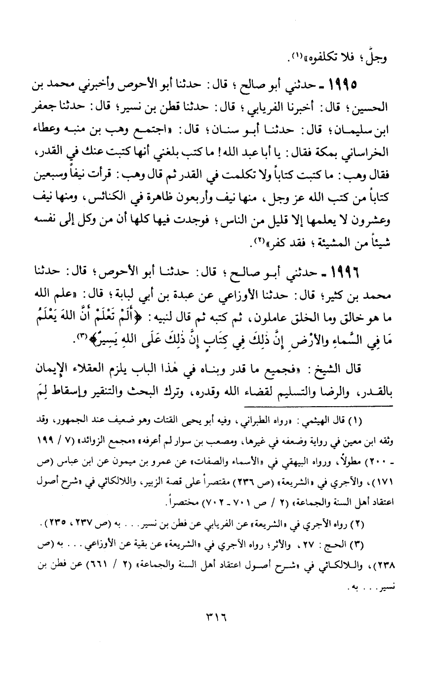 1995 - حَدَّثَنِي أَبُو صَالِحٍ، قَالَ: حَدَّثَنَا أَبُو الْأَحْوَصِ، وَأَخْبَرَنِي مُحَمَّدُ بْنُ الْحُسَيْنِ، قَالَ: أَخْبَرَنَا الْفِرْيَابِيُّ، قَالَ: حَدَّثَنَا قَطَنُ بْنُ نُسَيْرٍ، قَالَ: حَدَّثَنَا جَعْفَرُ بْنُ سُلَيْمَانَ، قَالَ: حَدَّثَنَا أَبُو سِنَانٍ، قَالَ: " اجْتَمَعَ وَهْبُ بْنُ مُنَبِّهٍ، وَعَطَاءٌ الْخُرَاسَانِيُّ بِمَكَّةَ فَقَالَ: يَا أَبَا عَبْدِ اللَّهِ مَا كُتُبٌ بَلَغَنِي أَنَّهَا كُتِبَتْ عَنْكَ فِي الْقَدَرِ؟ فَقَالَ وَهْبٌ: §مَا كَتَبْتُ كِتَابًا وَلَا تَكَلَّمْتُ فِي الْقَدَرِ، ثُمَّ قَالَ وَهْبٌ: قَرَأْتُ نَيِّفًا وَسَبْعِينَ كِتَابًا مِنْ كُتُبِ اللَّهِ عَزَّ وَجَلَّ، مِنْهَا نَيِّفٌ وَأَرْبَعُونَ ظَاهِرَةٌ فِي الْكَنَائِسِ، وَمِنْهَا نَيِّفٌ وَعِشْرُونَ لَا يَعْلَمُهَا إِلَّا قَلِيلٌ مِنَ النَّاسِ، فَوَجَدْتُ فِيهَا كُلِّهَا أَنَّ مَنْ وَكَّلَ إِلَى نَفْسِهِ شَيْئًا مِنَ الْمَشِيئَةِ، فَقَدْ كَفَرَ "