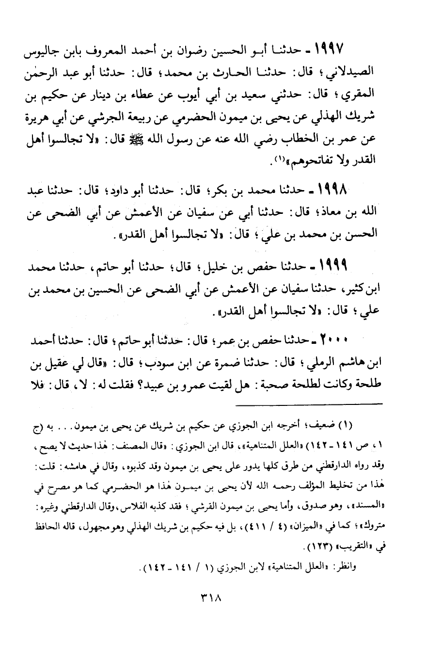 1997 - حَدَّثَنَا أَبُو الْحُسَيْنِ رِضْوَانُ بْنُ أَحْمَدَ الْمَعْرُوفُ بِابْنِ جَالِيُوسَ الصَّيْدَلَانِيِّ قَالَ: حَدَّثَنَا الْحَارِثُ بْنُ مُحَمَّدٍ، قَالَ: حَدَّثَنَا أَبُو عَبْدِ الرَّحْمَنِ الْمُقْرِئُ، قَالَ: حَدَّثَنِي سَعِيدُ بْنُ أَبِي أَيُّوبَ، عَنْ عَطَاءِ بْنِ دِينَارٍ، عَنْ حَكِيمِ بْنِ شَرِيكٍ الْهُذَلِيِّ، عَنْ يَحْيَى بْنِ مَيْمُونٍ الْحَضْرَمِيِّ، عَنْ رَبِيعَةَ الْجُرَشِيِّ، عَنْ أَبِي هُرَيْرَةَ، عَنْ عُمَرَ بْنِ الْخَطَّابِ، رَضِي اللَّهُ عَنْهُ، عَنْ رَسُولِ اللَّهِ صَلَّى اللَّهُ عَلَيْهِ وَسَلَّمَ قَالَ: § «لَا تُجَالِسُوا أَهْلَ الْقَدَرِ وَلَا تُفَاتِحُوهُمْ»