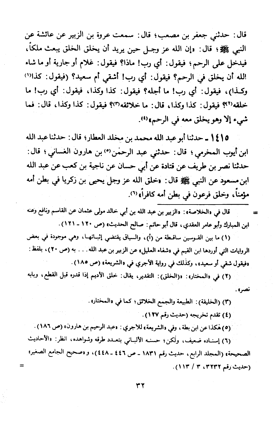 1415 - حَدَّثَنَا أَبُو عَبْدِ اللَّهِ مُحَمَّدُ بْنُ مَخْلَدٍ الْعَطَّارُ قَالَ: حَدَّثَنَا عَبْدُ اللَّهِ بْنُ أَيُّوبَ الْمُخَرِّمِيُّ، قَالَ: حَدَّثَنِي عَبْدُ الرَّحْمَنِ بْنُ هَارُونَ الْغَسَّانِيُّ، قَالَ: حَدَّثَنَا نَصْرُ بْنُ طَرِيفٍ، عَنْ قَتَادَةَ، عَنْ أَبِي حَسَّانَ، عَنْ نَاجِيَةَ بْنِ كَعْبٍ، عَنْ عَبْدِ اللَّهِ بْنِ مَسْعُودٍ، عَنِ النَّبِيِّ صَلَّى اللَّهُ عَلَيْهِ وَسَلَّمَ قَالَ: § «خَلَقَ اللَّهُ عَزَّ وَجَلَّ يَحْيَى بْنَ زَكَرِيَّا فِي بَطْنِ أُمِّهِ مُؤْمِنًا، وَخَلَقَ فِرْعَوْنَ فِي بَطْنِ أُمِّهِ كَافِرًا»