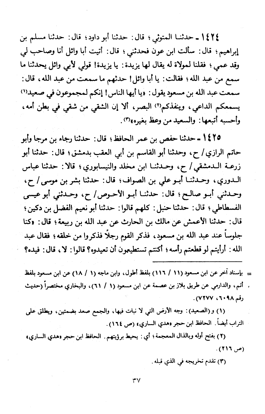 1425 - حَدَّثَنَا حَفْصُ بْنُ عُمَرَ الْحَافِظُ، قَالَ: حَدَّثَنَا رَجَاءُ بْنُ مُرَجًّى، وَأَبُو حَاتِمٍ الرَّازِيُّ، ح وَحَدَّثَنَا أَبُو الْقَاسِمِ بْنُ أَبِي الْعَقِبِ، بِدِمَشْقَ قَالَ: حَدَّثَنَا أَبُو زُرْعَةَ الدِّمَشْقِيُّ، ح وَحَدَّثَنَا ابْنُ مَخْلَدٍ، وَالنَيْسَابُورِيُّ، قَالَا: حَدَّثَنَا عَبَّاسٌ الدُّورِيُّ، وَحَدَّثَنَا أَبُو عَلِيِّ بْنُ الصَّوَّافِ، قَالَ: حَدَّثَنَا بِشْرُ بْنُ مُوسَى، ح وَحَدَّثَنِي أَبُو صَالِحٍ، قَالَ: حَدَّثَنَا أَبُو الْأَحْوَصِ، ح وَحَدَّثَنِي أَبُو عِيسَى الْفُسْطَاطِيُّ، قَالَ: حَدَّثَنَا حَنْبَلٌ، كُلُّهُمْ قَالُوا: حَدَّثَنَا أَبُو نُعَيْمٍ الْفَضْلُ بْنُ دُكَيْنٍ، قَالَ: حَدَّثَنَا الْأَعْمَشُ، عَنْ مَالِكِ بْنِ الْحَارِثِ، عَنْ عَبْدِ اللَّهِ بْنِ رَبِيعَةَ، قَالَ: كُنَّا جُلُوسًا عِنْدَ عَبْدِ اللَّهِ بْنِ مَسْعُودٍ، فَذَكَرَ الْقَوْمَ رَجُلًا فَذَكَرُوا مِنْ خُلُقِهِ، فَقَالَ عَبْدُ اللَّهِ: أَرَأَيْتُمْ لَوْ قَطَعْتُمْ رَأْسَهُ، أَكُنْتُمْ تَسْتَطِيعُونَ أَنْ تُعِيدُوهُ؟ قَالُوا: لَا، قَالَ: فَيَدَهُ؟ -[38]- قَالُوا: لَا، قَالَ فَرِجْلَهُ؟ قَالُوا: لَا، قَالَ: فَإِنَّكُمْ §لَا تَسْتَطِيعُونَ أَنْ تُغَيِّرُوا خُلُقَهُ حَتَّى تُغَيِّرُوا خَلْقَهُ، إِنَّ النُّطْفَةَ لَتَسْتَقِرُ فِي الرَّحِمِ أَرْبَعِينَ لَيْلَةً، ثُمَّ تَنْحَدِرُ دَمًا، ثُمَّ تَكُونُ عَلَقَةً، ثُمَّ تَكُونُ مُضْغَةً، ثُمَّ يَبْعَثُ اللَّهُ إِلَيْهِ مَلَكًا، فَيَكْتُبُ رِزْقَهُ وَخُلُقَهُ وَخَلْقَهُ وَشَقِيًّا أَوْ سَعِيدًا "