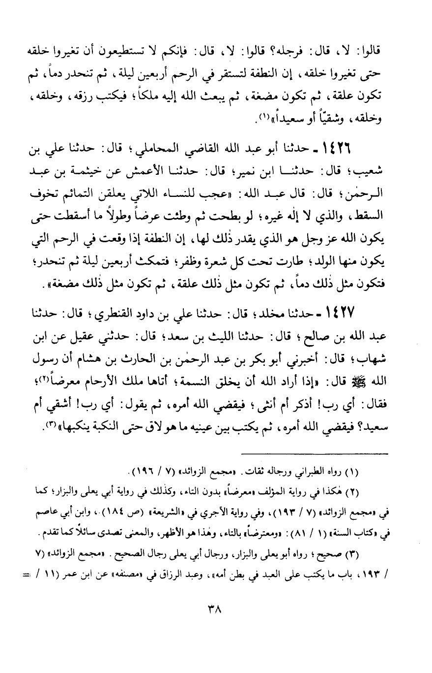 1426 - حَدَّثَنَا أَبُو عَبْدِ اللَّهِ الْقَاضِي الْمَحَامِلِيُّ، قَالَ: حَدَّثَنَا عَلِيُّ بْنُ شُعَيْبٍ، قَالَ: حَدَّثَنَا ابْنُ نُمَيْرٍ، قَالَ: حَدَّثَنَا الْأَعْمَشُ، عَنْ خَيْثَمَةَ بْنِ عَبْدِ الرَّحْمَنِ، قَالَ: قَالَ عَبْدُ اللَّهِ: §عَجَبٌ لِلنِّسَاءِ اللَّاتِي يُعَلِّقْنَ التَّمَائِمَ تَخَوُّفَ السِّقْطَ، وَالَّذِي لَا إِلَهَ غَيْرُهُ، لَوْ بُطِحَتْ ثُمَّ وَطِئْتَ عَرْضًا وَطُولًا مَا أَسْقَطَتْ حَتَّى يَكُونَ اللَّهُ عَزَّ وَجَلَّ هُوَ الَّذِي يُقَدِّرُ ذَلِكَ لَهَا، إِنَّ النُّطْفَةَ إِذَا وَقَعَتْ فِي الرَّحِمِ الَّتِي يَكُونُ مِنْهَا الْوَلَدُ، طَارَتْ تَحْتَ كُلِّ شَعْرَةٍ وَظُفْرٍ، فَتَمْكُثُ أَرْبَعِينَ لَيْلَةً ثُمَّ تَنْحَدِرُ، فَتَكُونُ مِثْلَ ذَلِكَ دَمًا، ثُمَّ تَكُونُ مِثْلَ ذَلِكَ عَلَقَةً، ثُمَّ تَكُونُ مِثْلَ ذَلِكَ مُضْغَةً "