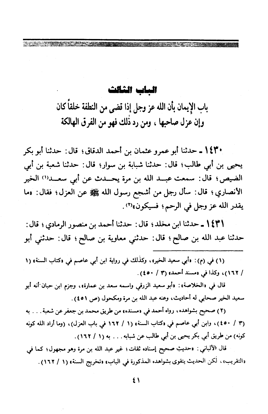1430 - حَدَّثَنَا أَبُو عَمْرٍو عُثْمَانُ بْنُ أَحْمَدَ الدَّقَّاقُ قَالَ: حَدَّثَنَا أَبُو بَكْرٍ يَحْيَى بْنُ أَبِي طَالِبٍ قَالَ: حَدَّثَنَا شَبَابَةُ بْنُ سِوَارٍ، قَالَ: حَدَّثَنَا شُعْبَةُ بْنُ أَبِي الضَّيْصِ، قَالَ: سَمِعْتُ عَبْدَ اللَّهِ بْنَ مُرَّةَ، يُحَدِّثُ عَنْ أَبِي سَعْدِ الْخَيْرِ الْأَنْصَارِيِّ، قَالَ: سَأَلَ رَجُلٌ مِنْ أَشْجَعَ رَسُولَ اللَّهِ صَلَّى اللَّهُ عَلَيْهِ وَسَلَّمَ عَنِ الْعَزْلِ، فَقَالَ: § «مَا يُقَدِّرُ اللَّهُ عَزَّ وَجَلَّ فِي الرَّحِمِ فَسَيَكُونُ»