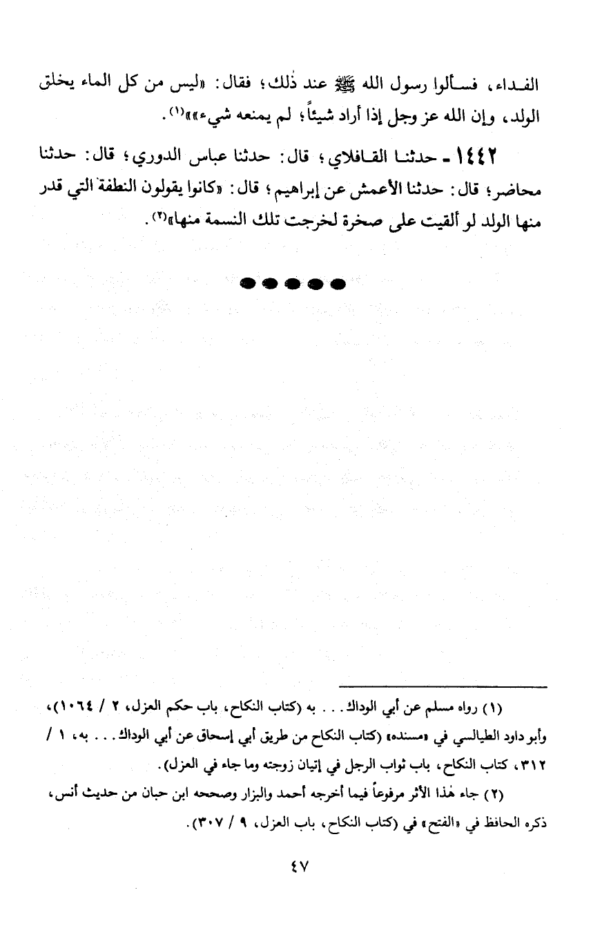 1442 - حَدَّثَنَا الْقَافْلَائِيُّ، قَالَ: حَدَّثَنَا عَبَّاسٌ الدُّورِيُّ، قَالَ: حَدَّثَنَا مُحَاضِرٌ، قَالَ: حَدَّثَنَا الْأَعْمَشُ، عَنْ إِبْرَاهِيمَ، قَالَ: كَانُوا يَقُولُونَ: § «النُّطْفَةُ الَّتِي قُدِّرَ مِنْهَا الْوَلَدُ لَوْ أُلْقِيَتْ عَلَى صَخْرَةٍ لَخَرَجَتْ تِلْكَ النَّسَمَةُ مِنْهَا»
