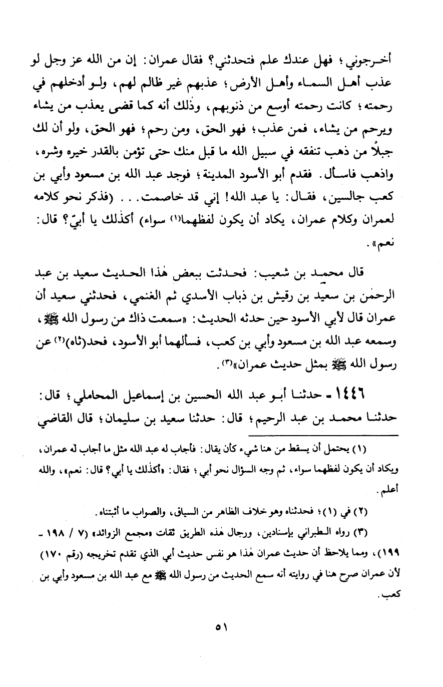 1446 - حَدَّثَنَا أَبُو عَبْدِ اللَّهِ الْحُسَيْنُ بْنُ إِسْمَاعِيلَ الْمَحَامِلِيُّ، قَالَ: حَدَّثَنَا مُحَمَّدُ بْنُ عَبْدِ الرَّحِيمِ، قَالَ: حَدَّثَنَا سَعِيدُ بْنُ سُلَيْمَانَ، قَالَ الْقَاضِي -[52]- الْمَحَامِلِيُّ، ح وَحَدَّثَنَا فَضْلُ بْنُ سَهْلٍ الْأَعْرَجُ، قَالَ: حَدَّثَنَا أَبُو النَّضْرِ، قَالَا: حَدَّثَنَا عَبْدُ الْوَاحِدِ بْنُ سُلَيْمٍ، قَالَ: سَمِعْتُ عَطَاءَ بْنَ أَبِي رَبَاحٍ، قَالَ: سَأَلْتُ الْوَلِيدَ بْنَ عُبَادَةَ بْنِ الصَّامِتِ: كَيْفَ كَانَتْ وَصِيَّةُ أَبِيكَ حِينَ حَضَرَهُ الْمَوْتُ؟ فَقَالَ: دَعَانِي فَقَالَ: يَا بُنَيَّ، اتَّقِ اللَّهَ وَاعْلَمْ أَنَّكَ §لَنْ تَتَّقِيَ اللَّهَ وَلَنْ تَبْلُغَ الْعِلْمَ حَتَّى تُؤْمِنَ بِاللَّهِ وَحْدَهُ، وَتُؤْمِنَ بِالْقَدَرِ خَيْرِهِ وَشَرِّهِ، قُلْتُ: يَا أَبَتِ، كَيْفَ لِي أَنْ أُؤْمِنَ بِالْقَدَرِ خَيْرِهِ وَشَرِّهِ؟ قَالَ: تَعْلَمُ أَنَّ مَا أَصَابَكَ لَمْ يَكُنْ لِيُخْطِئَكَ، وَأَنَّ مَا أَخْطَأَكَ لَمْ يَكُنْ لِيُصِيبَكَ، هَذَا الْقَدَرُ، أَظُنُّهُ قَالَ: فَإِنْ مِتَّ عَلَى غَيْرِ هَذَا، دَخَلْتَ النَّارَ، سَمِعْتُ رَسُولَ اللَّهِ صَلَّى اللَّهُ عَلَيْهِ وَسَلَّمَ يَقُولُ: " إِنَّ أَوَّلَ مَا خَلَقَ اللَّهُ الْقَلَمُ فَقَالَ لَهُ: اكْتُبْ، فَقَالَ: أَيْ رَبِّ، وَمَا أَكْتُبُ؟ قَالَ: الْقَدَرَ، فَجَرَى الْقَلَمُ تِلْكَ السَّاعَةِ بِمَا هُوَ كَائِنٌ إِلَى الْأَبَدِ "