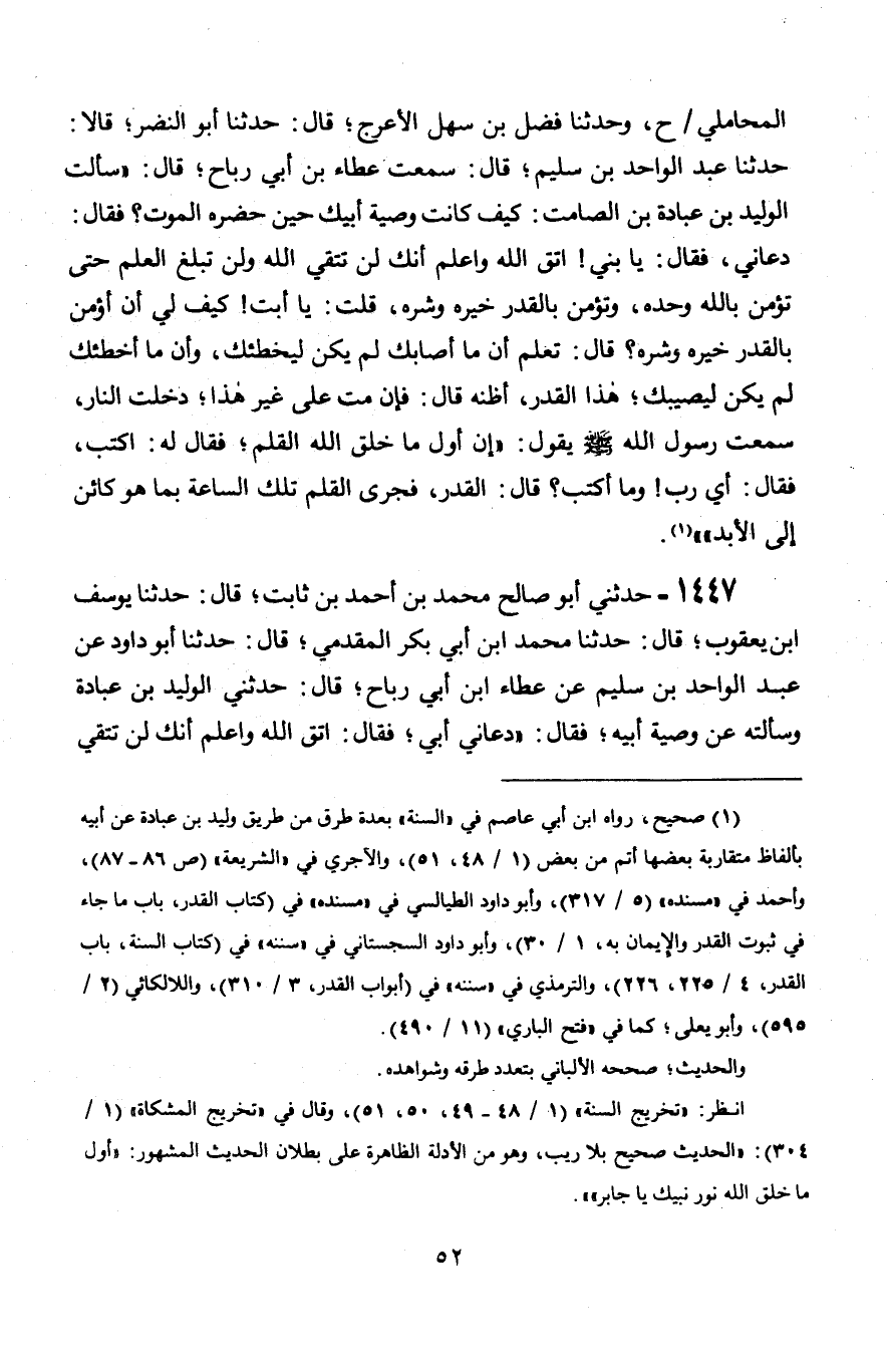 1447 - حَدَّثَنِي أَبُو صَالِحٍ مُحَمَّدُ بْنُ أَحْمَدَ بْنِ ثَابِتٍ قَالَ: حَدَّثَنَا يُوسُفُ بْنُ يَعْقُوبَ، قَالَ: حَدَّثَنَا مُحَمَّدُ بْنُ أَبِي بَكْرٍ الْمُقَدَّمِيُّ، قَالَ: حَدَّثَنَا أَبُو دَاوُدَ، عَنْ عَبْدِ الْوَاحِدِ بْنِ سُلَيْمٍ، عَنْ عَطَاءِ بْنِ أَبِي رَبَاحٍ، قَالَ: حَدَّثَنِي الْوَلِيدُ بْنُ عُبَادَةَ، وَسَأَلْتُهُ عَنْ وَصِيَّةَ أَبِيهِ، فَقَالَ: دَعَانِي أَبِي فَقَالَ: اتَّقِ اللَّهَ وَاعْلَمْ أَنَّكَ §لَنْ تَتَّقِيَ -[53]- اللَّهَ حَتَّى تُؤْمِنَ بِاللَّهِ وَتُؤْمِنَ بِالْقَدَرِ، قُلْتُ: وَكَيْفَ لِي أَنْ أُؤْمِنَ بِالْقَدَرِ؟ قَالَ: تُؤْمِنُ بِالْقَدَرِ كُلِّهِ خَيْرِهِ وَشَرِّهِ، وَتَعْلَمُ أَنَّ مَا أَصَابَكَ لَمْ يَكُنْ لِيُخْطِئَكَ، وَمَا أَخْطَأَكَ لَمْ يَكُنْ لِيُصِيبَكَ، عَلَى هَذَا الْقَدَرُ، فَإِنْ مِتَّ عَلَى غَيْرِ هَذَا، أُدْخِلْتَ النَّارَ "