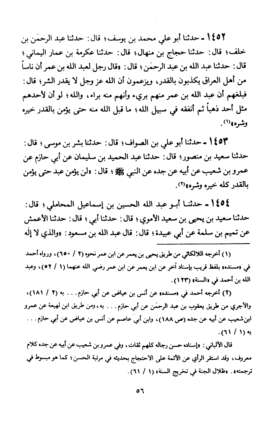 1453 - حَدَّثَنَا أَبُو عَلِيِّ بْنُ الصَّوَّافِ، قَالَ: حَدَّثَنَا بِشْرُ بْنُ مُوسَى، قَالَ: حَدَّثَنَا سَعِيدُ بْنُ مَنْصُورٍ، قَالَ: حَدَّثَنَا عَبْدُ الْحَمِيدِ بْنُ سُلَيْمَانَ، عَنْ أَبِي حَازِمٍ، عَنْ عَمْرِو بْنِ شُعَيْبٍ، عَنْ أَبِيهِ، عَنْ جَدِّهِ، عَنِ النَّبِيِّ صَلَّى اللَّهُ عَلَيْهِ وَسَلَّمَ قَالَ: § «لَنْ يُؤْمِنَ عَبْدٌ حَتَّى يُؤْمِنَ بِالْقَدَرِ كُلِّهِ خَيْرِهِ وَشَرِّهِ»