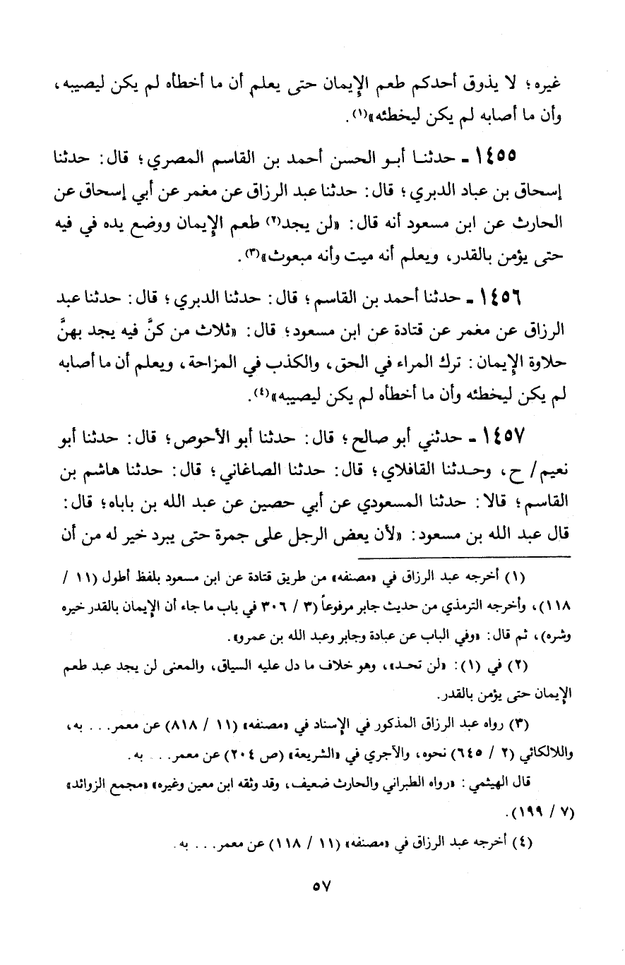 1455 - حَدَّثَنَا أَبُو الْحَسَنِ أَحْمَدُ بْنُ الْقَاسِمِ الْمِصْرِيُّ قَالَ: حَدَّثَنَا إِسْحَاقُ بْنُ عَبَّادٍ الدَّبَرِيُّ، قَالَ: حَدَّثَنَا عَبْدُ الرَّزَّاقِ، عَنْ مَعْمَرٍ، عَنْ أَبِي إِسْحَاقَ، عَنِ الْحَارِثِ، عَنِ ابْنِ مَسْعُودٍ، أَنَّهُ قَالَ: §لَنْ يَجِدَ طَعْمَ الْإِيمَانِ، وَوَضَعَ يَدَهُ فِي فِيهِ، حَتَّى يُؤْمِنَ بِالْقَدَرِ، وَيَعْلَمَ أَنَّهُ مَيِّتٌ وَأَنَّهُ مَبْعُوثٌ "