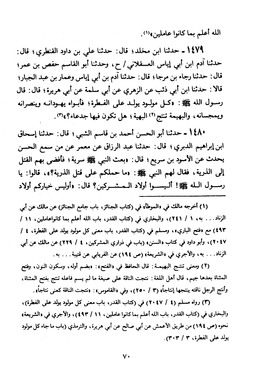 1479 - حَدَّثَنَا ابْنُ مَخْلَدٍ، قَالَ: حَدَّثَنَا عَلِيُّ بْنُ دَاوُدَ الْقَنْطَرِيُّ، قَالَ: حَدَّثَنَا آدَمُ بْنُ أَبِي إِيَاسٍ الْعَسْقَلَانِيُّ، ح وَحَدَّثَنَا أَبُو الْقَاسِمِ حَفْصُ بْنُ عُمَرَ قَالَ: حَدَّثَنَا رَجَاءُ بْنُ مُرَجًّى، قَالَ: حَدَّثَنَا آدَمُ بْنُ أَبِي إِيَاسٍ، وَعَمَّارُ بْنُ عَبْدِ الْجَبَّارِ، قَالَا: حَدَّثَنَا ابْنُ أَبِي ذِئْبٍ، عَنِ الزُّهْرِيِّ، عَنْ أَبِي سَلَمَةَ، عَنْ أَبِي هُرَيْرَةَ، قَالَ: قَالَ رَسُولُ اللَّهِ صَلَّى اللَّهُ عَلَيْهِ وَسَلَّمَ: § «كُلُّ مَوْلُودٍ يُولَدُ عَلَى الْفِطْرَةِ، فَأَبَوَاهُ يُهَوِّدَانِهِ وَيُنَصِّرَانِهِ وَيُمَجِّسَانِهِ، وَالْبَهِيمَةُ تُنْتَجُ الْبَهِيمَةَ، هَلْ تَكُونُ فِيهَا جَدْعَاءُ»؟ "
