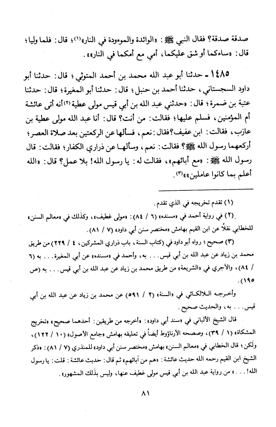1485 - حَدَّثَنَا أَبُو عَبْدِ اللَّهِ مُحَمَّدُ بْنُ أَحْمَدَ الْمَتُّوثِيُّ قَالَ: حَدَّثَنَا أَبُو دَاوُدَ السِّجِسْتَانِيُّ، حَدَّثَنَا أَحْمَدُ بْنُ حَنْبَلٍ، قَالَ: حَدَّثَنَا أَبُو الْمُغِيرَةِ، قَالَ: حَدَّثَنَا عُتْبَةُ بْنُ ضَمْرَةَ، قَالَ: حَدَّثَنِي عَبْدُ اللَّهِ بْنُ أَبِي قَيْسٍ، مَوْلَى عَطِيَّةَ أَنَّهُ أَتَى عَائِشَةَ أُمَّ الْمُؤْمِنِينَ فَسَلَّمَ عَلَيْهَا فَقَالَتْ: مَنْ أَنْتَ؟ قَالَ: أَنَا عَبْدُ اللَّهِ مَوْلَى عَطِيَّةَ بْنِ عَازِبٍ، فَقَالَتْ: ابْنُ عَفِيفٍ؟ فَقَالَ: نَعَمْ، فَسَأَلَهَا عَنِ الرَّكْعَتَيْنِ بَعْدَ صَلَاةِ الْعَصْرِ، أَرَكَعَهُمَا رَسُولُ اللَّهِ صَلَّى اللَّهُ عَلَيْهِ وَسَلَّمَ؟ فَقَالَتْ: نَعَمْ، وَسَأَلَهَا عَنْ ذَرَارِيِّ الْكُفَّارِ، فَقَالَتْ: قَالَ رَسُولُ اللَّهِ صَلَّى اللَّهُ عَلَيْهِ وَسَلَّمَ: «مَعَ آبَائِهِمْ» فَقَالَتْ لَهُ: يَا رَسُولَ اللَّهِ بِلَا عَمَلٍ؟ قَالَ: § «اللَّهُ أَعْلَمُ بِمَا كَانُوا عَامِلِينَ»