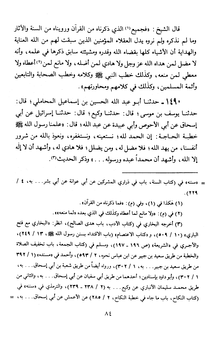 1490 - حَدَّثَنَا أَبُو عَبْدِ اللَّهِ الْحُسَيْنُ بْنُ إِسْمَاعِيلَ الْمَحَامِلِيُّ، قَالَ: حَدَّثَنَا يُوسُفُ بْنُ مُوسَى، قَالَ: حَدَّثَنَا وَكِيعٌ، قَالَ: حَدَّثَنَا إِسْرَائِيلُ، عَنْ أَبِي إِسْحَاقَ، عَنْ أَبِي الْأَحْوَصِ، وَأَبِي عُبَيْدَةَ عَنْ عَبْدِ اللَّهِ، قَالَ: عَلَّمَنَا رَسُولُ اللَّهِ صَلَّى اللَّهُ عَلَيْهِ وَسَلَّمَ خُطْبَةَ الْحَاجَةِ: «إِنَّ §الْحَمْدَ لِلَّهِ نَسْتَعِينُهُ وَنَسْتَغْفِرُهُ، وَنَعُوذُ بِاللَّهِ مِنْ شُرُورِ أَنْفُسِنَا، مَنْ يَهْدِ اللَّهُ فَلَا مُضِلَّ لَهُ، وَمَنْ يُضْلِلْ فَلَا هَادِيَ لَهُ، وَأَشْهَدُ أَنْ لَا إِلَهَ إِلَّا اللَّهُ، وَأَشْهَدُ أَنَّ مُحَمَّدًا عَبْدُهُ وَرَسُولُهُ» وَذَكَرَ الْحَدِيثَ