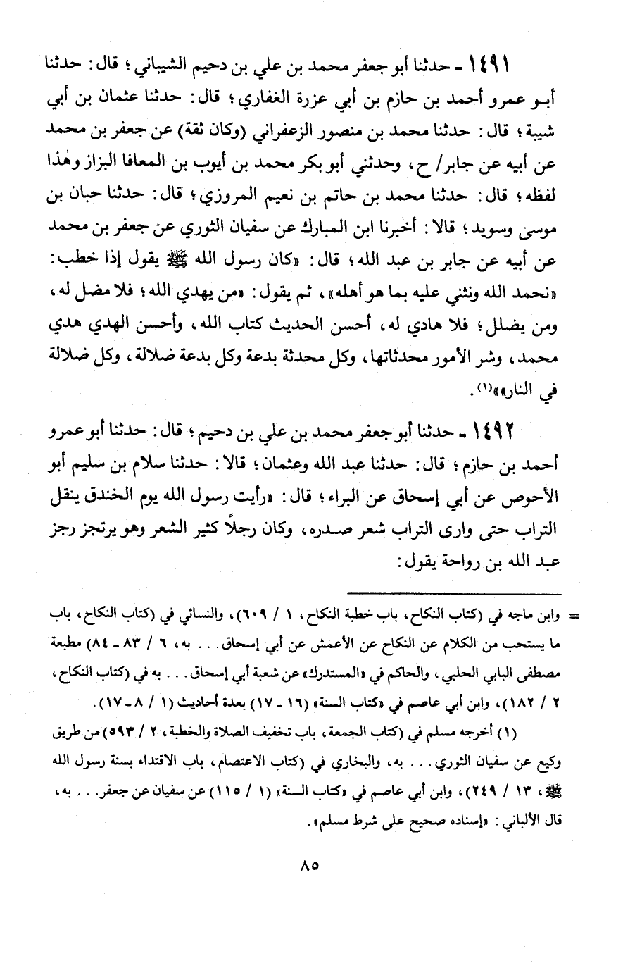 1491 - حَدَّثَنَا أَبُو جَعْفَرٍ مُحَمَّدُ بْنُ عَلِيِّ بْنِ دُحَيْمٍ الشَّيْبَانِيُّ قَالَ: حَدَّثَنَا أَبُو عَمْرٍو أَحْمَدُ بْنُ حَازِمِ بْنِ أَبِي عَزْرَةَ الْغِفَارِيُّ قَالَ: حَدَّثَنَا عُثْمَانُ بْنُ أَبِي شَيْبَةَ، قَالَ: حَدَّثَنَا مُحَمَّدُ بْنُ مَنْصُورٍ الزَّعْفَرَانِيُّ، وَكَانَ ثِقَةً، عَنْ جَعْفَرِ بْنِ مُحَمَّدٍ، عَنْ أَبِيهِ، عَنْ جَابِرٍ، ح وَحَدَّثَنِي أَبُو بَكْرٍ مُحَمَّدُ بْنُ أَيُّوبَ بْنِ الْمُعَافَا الْبَزَّازُ، وَهَذَا لَفْظُهُ قَالَ: حَدَّثَنَا مُحَمَّدُ بْنُ حَاتِمِ بْنِ نُعَيْمٍ الْمَرْوَزِيُّ، قَالَ: حَدَّثَنَا حَبَّانُ بْنُ مُوسَى، وَسُوَيْدٌ، قَالَا: أَخْبَرَنَا ابْنُ الْمُبَارَكِ، عَنْ سُفْيَانَ الثَّوْرِيِّ، عَنْ جَعْفَرِ بْنِ مُحَمَّدٍ، عَنْ أَبِيهِ، عَنْ جَابِرِ بْنِ عَبْدِ اللَّهِ، قَالَ: كَانَ رَسُولُ اللَّهِ صَلَّى اللَّهُ عَلَيْهِ وَسَلَّمَ يَقُولُ إِذَا خَطَبَ: § «نَحْمَدُ اللَّهَ وَنُثْنِي عَلَيْهِ بِمَا هُوَ أَهْلُهُ» ثُمَّ يَقُولُ: «مَنْ يَهْدِي اللَّهُ فَلَا مُضِلَّ لَهُ، وَمَنْ يُضْلِلْ فَلَا هَادِيَ لَهُ، أَحْسَنُ الْحَدِيثِ كِتَابُ اللَّهِ، وَأَحْسَنُ الْهَدْيِ هَدْيُ مُحَمَّدٍ، وَشَرُّ الْأُمُورِ مُحْدَثَاتُهَا، وَكُلُّ مُحْدَثَةٍ بِدْعَةٌ وَكُلُّ بِدْعَةٍ ضَلَالَةٌ، وَكُلُّ ضَلَالَةٌ فِي النَّارِ»