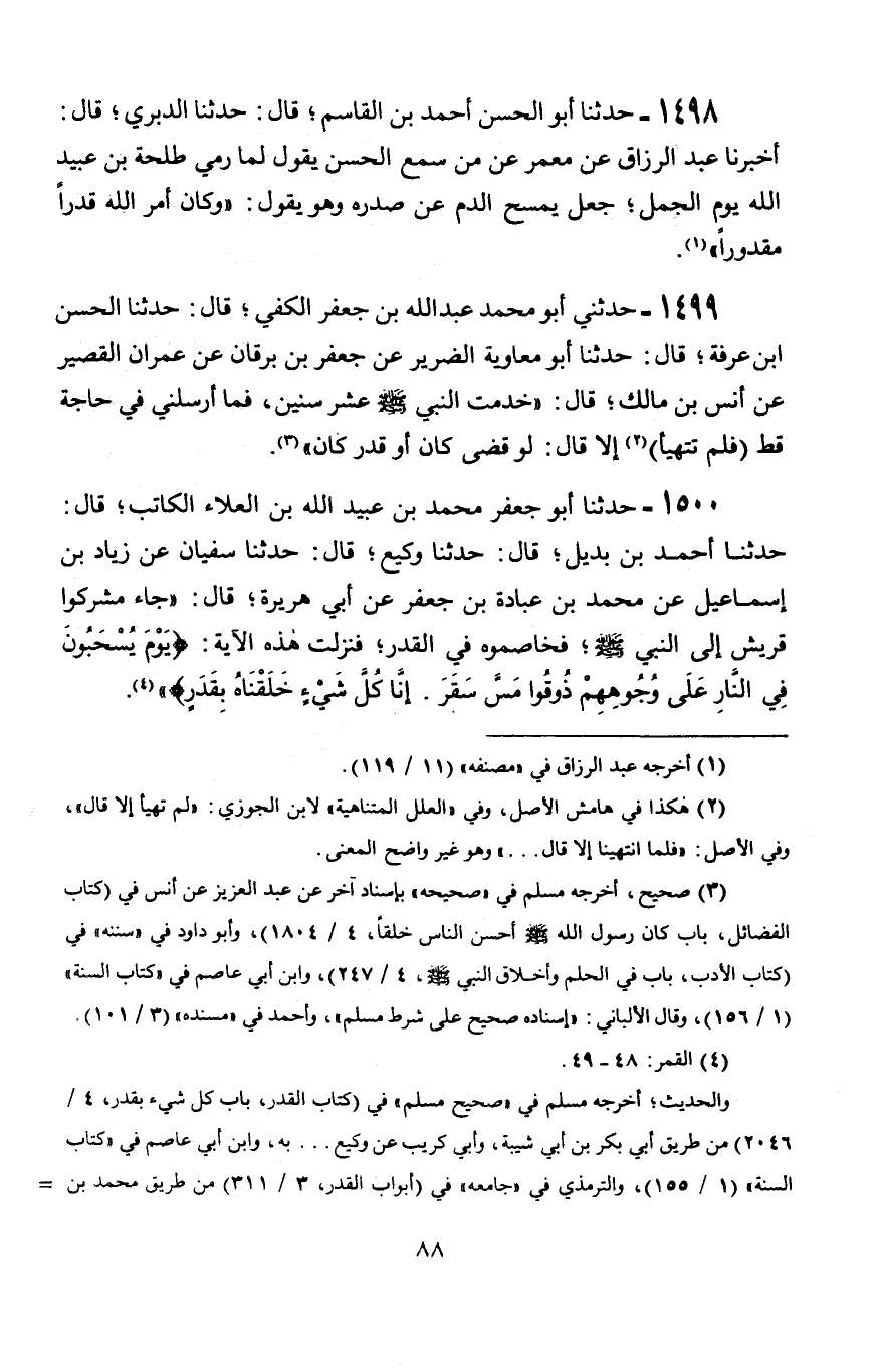 1499 - حَدَّثَنِي أَبُو مُحَمَّدٍ عَبْدُ اللَّهِ بْنُ جَعْفَرٍ الْكَفِّيُّ، قَالَ: حَدَّثَنَا الْحَسَنُ بْنُ عَرَفَةَ، قَالَ: حَدَّثَنَا أَبُو مُعَاوِيَةَ الضَّرِيرُ، عَنْ جَعْفَرِ بْنِ بُرْقَانَ، عَنْ عِمْرَانَ الْقَصِيرِ، عَنْ أَنَسِ بْنِ مَالِكٍ، قَالَ: خَدَمْتُ النَّبِيَّ صَلَّى اللَّهُ عَلَيْهِ وَسَلَّمَ عَشْرَ سِنِينَ، فَمَا أَرْسَلَنِي فِي حَاجَةٍ قَطُّ فَلَمْ تَتَهَيَّأْ إِلَّا قَالَ: § «لَوْ قَضَى كَانَ أَوْ قَدَّرَ كَانَ»
