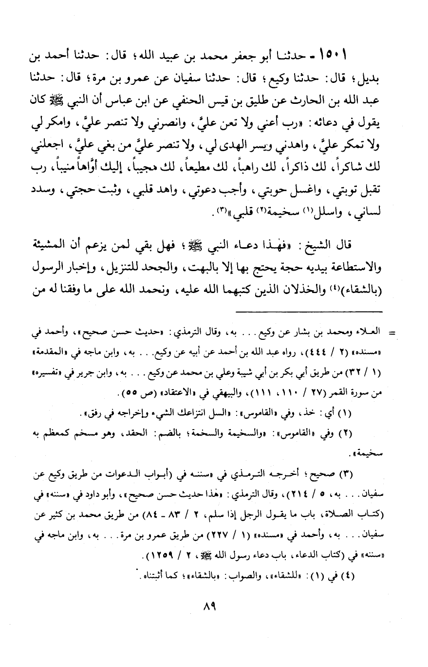 1501 - حَدَّثَنَا أَبُو جَعْفَرٍ مُحَمَّدُ بْنُ عُبَيْدِ اللَّهِ قَالَ: حَدَّثَنَا أَحْمَدُ بْنُ بُدَيْلٍ، قَالَ: حَدَّثَنَا وَكِيعٌ، قَالَ: حَدَّثَنَا سُفْيَانُ، عَنْ عَمْرِو بْنِ مُرَّةَ، قَالَ: حَدَّثَنَا عَبْدُ اللَّهِ بْنُ الْحَارِثِ، عَنْ طُلَيْقِ بْنِ قَيْسٍ الْحَنَفِيِّ، عَنِ ابْنِ عَبَّاسٍ، أَنَّ النَّبِيَّ صَلَّى اللَّهُ عَلَيْهِ وَسَلَّمَ كَانَ يَقُولُ فِي دُعَائِهِ: «§رَبِّ أَعِنِّي وَلَا تُعِنْ عَلَيَّ، وَانْصُرْنِي وَلَا تَنْصُرْ عَلَيَّ، وَامْكُرْ لِي وَلَا تَمْكُرْ عَلَيَّ، وَاهْدِنِي وَيَسِّرِ الْهُدَى لِي، وَلَا تَنْصُرْ عَلَيَّ مَنْ بَغَى عَلَيَّ، اجْعَلْنِي لَكَ شَاكِرًا، لَكَ ذَاكِرًا، لَكَ رَاهِبًا، لَكَ مُطِيعًا، لَكَ مُجِيبًا، إِلَيْكَ أَوَّاهًا مُنِيبًا، رَبِّ تَقَبَّلْ تَوْبَتِي، وَاغْسِلْ حَوْبَتِي، وَأَجِبْ دَعْوَتِي، وَاهْدِ قَلْبِي، وَثَبِّتْ حُجَّتِي، وَسَدِّدْ لِسَانِي، وَاسْلُلْ سَخِيمَةَ قَلْبِي» قَالَ الشَّيْخُ: فَهَذَا دُعَاءُ النَّبِيِّ صَلَّى اللَّهُ عَلَيْهِ وَسَلَّمَ، فَهَلْ بَقِيَ لِمَنْ يَزْعُمُ أَنَّ الْمَشِيئَةَ وَالِاسْتِطَاعَةَ بِيَدَيْهِ حُجَّةٌ يَحْتَجُّ بِهَا إِلَّا بِالْبَهْتِ، وَالْجَحْدِ لِلتَّنْزِيلِ، وَإِخْبَارِ الرَّسُولِ بِالشَّقَّاءِ وَالْخُذْلَانِ اللَّذَيْنِ كَتَبَهُمَا اللَّهُ عَلَيْهِ، وَنَحْمَدُ اللَّهَ عَلَى مَا وَفَّقَنَا لَهُ مِنْ -[90]- مَعْرِفَةِ الْحَقِّ وَهَدَانَا إِلَيْهِ