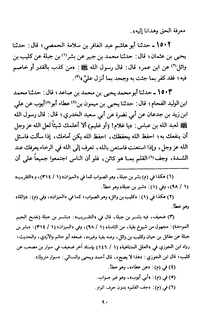 1502 - حَدَّثَنَا أَبُو هَاشِمٍ عَبْدُ الْغَافِرِ بْنُ سَلَامَةَ الْحِمْصِيُّ، قَالَ: حَدَّثَنَا يَحْيَى بْنُ عُثْمَانَ، قَالَ: حَدَّثَنَا مُحَمَّدُ بْنُ جُبَيْرٍ، عَنْ بِشْرِ بْنِ جَبَلَةَ، عَنْ كُلَيْبِ بْنِ وَائِلٍ، عَنِ ابْنِ عُمَرَ قَالَ: قَالَ رَسُولُ اللَّهِ صَلَّى اللَّهُ عَلَيْهِ وَسَلَّمَ: «§مَنْ كَذَّبَ بِالْقَدَرِ أَوْ خَاصَمَ فِيهِ، فَقَدْ كَفَرَ بِمَا جِئْتُ بِهِ وَجَحَدَ بِمَا أُنْزِلَ عَلَيَّ»