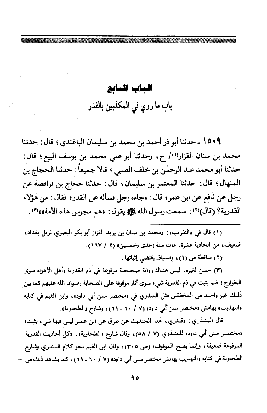 1509 - حَدَّثَنَا أَبُو ذَرٍّ أَحْمَدُ بْنُ مُحَمَّدِ بْنِ سُلَيْمَانَ الْبَاغَنْدِيُّ قَالَ: حَدَّثَنَا مُحَمَّدُ بْنُ سِنَانٍ الْقَزَّازُ، ح وَحَدَّثَنَا أَبُو عَلِيٍّ مُحَمَّدُ بْنُ يُوسُفَ الْبَيَّعُ قَالَ: حَدَّثَنَا أَبُو مُحَمَّدٍ عَبْدُ الرَّحْمَنِ بْنُ خَلَفٍ الضَّبِّيُّ، قَالَا جَمِيعًا: حَدَّثَنَا الْحَجَّاجُ بْنُ الْمِنْهَالِ، قَالَ: حَدَّثَنَا الْمُعْتَمِرُ بْنُ سُلَيْمَانَ، قَالَ: حَدَّثَنَا حَجَّاجُ بْنُ فُرَافِصَةَ، عَنْ رَجُلٍ، عَنْ نَافِعٍ، عَنِ ابْنِ عُمَرَ، قَالَ: جَاءَهُ رَجُلٌ فَسَأَلَهُ عَنِ الْقَدَرِ، فَقَالَ: مَنْ هَؤُلَاءِ الْقَدَرِيَّةُ؟ قَالَ: سَمِعْتُ رَسُولَ اللَّهِ صَلَّى اللَّهُ عَلَيْهِ وَسَلَّمَ يَقُولُ: § «هُمْ مَجُوسُ هَذِهِ الْأُمَّةِ»