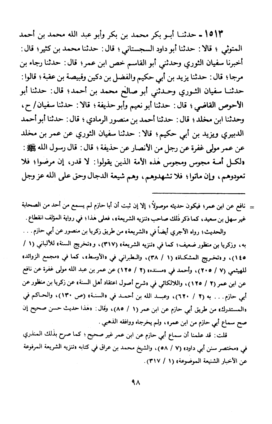 1513 - حَدَّثَنَا أَبُو بَكْرٍ مُحَمَّدُ بْنُ بَكْرٍ، وَأَبُو عَبْدِ اللَّهِ مُحَمَّدُ بْنُ أَحْمَدَ الْمَتُّوثِيُّ قَالَا: حَدَّثَنَا أَبُو دَاوُدَ السِّجِسْتَانِيُّ، قَالَ: حَدَّثَنَا مُحَمَّدُ بْنُ كَثِيرٍ، قَالَ: أَخْبَرَنَا سُفْيَانُ الثَّوْرِيُّ، وَحَدَّثَنِي أَبُو الْقَاسِمِ حَفْصُ بْنُ عُمَرَ قَالَ: حَدَّثَنَا رَجَاءُ بْنُ مُرَجًّى، قَالَ: حَدَّثَنَا يَزِيدُ بْنُ أَبِي حَكِيمٍ، وَالْفَضْلُ بْنُ دُكَيْنٍ، وَقَبِيصَةُ بْنُ عُقْبَةَ، قَالُوا: حَدَّثَنَا سُفْيَانُ الثَّوْرِيُّ، وَحَدَّثَنِي أَبُو صَالِحٍ مُحَمَّدُ بْنُ أَحْمَدَ قَالَ: حَدَّثَنَا أَبُو الْأَحْوَصِ الْقَاضِي، قَالَ: حَدَّثَنَا أَبُو نُعَيْمٍ، وَأَبُو حُذَيْفَةَ قَالَا: حَدَّثَنَا سُفْيَانُ، ح وَحَدَّثَنَا ابْنُ مَخْلَدٍ، قَالَ: حَدَّثَنَا أَحْمَدُ بْنُ مَنْصُورٍ الرَّمَادِيُّ، قَالَ: حَدَّثَنَا أَبُو أَحْمَدَ الدَّبِيرِيُّ، وَيَزِيدُ بْنُ أَبِي حَكِيمٍ، قَالَا: حَدَّثَنَا سُفْيَانُ الثَّوْرِيُّ، عَنْ عُمَرَ بْنِ مَخْلَدٍ، عَنْ عُمَرَ، مَوْلَى غُفْرَةَ، عَنْ رَجُلٍ مِنَ الْأَنْصَارِ، عَنْ حُذَيْفَةَ، قَالَ: قَالَ رَسُولُ اللَّهِ صَلَّى اللَّهُ عَلَيْهِ وَسَلَّمَ: " §لِكُلِّ أُمَّةٍ مَجُوسٌ، وَمَجُوسُ هَذِهِ الْأُمَّةِ الَّذِينَ يَقُولُونَ: لَا قَدَرَ، إِنْ مَرِضُوا فَلَا تَعُودُوهُمْ، وَإِنْ مَاتُوا فَلَا تَشْهَدُوهُمْ، وَهُمْ شِيعَةُ الدَّجَّالِ وَحَقٌّ عَلَى اللَّهِ عَزَّ وَجَلَّ -[99]- أَنْ يُلْحِقَهُمْ بِالدَّجَّالِ "