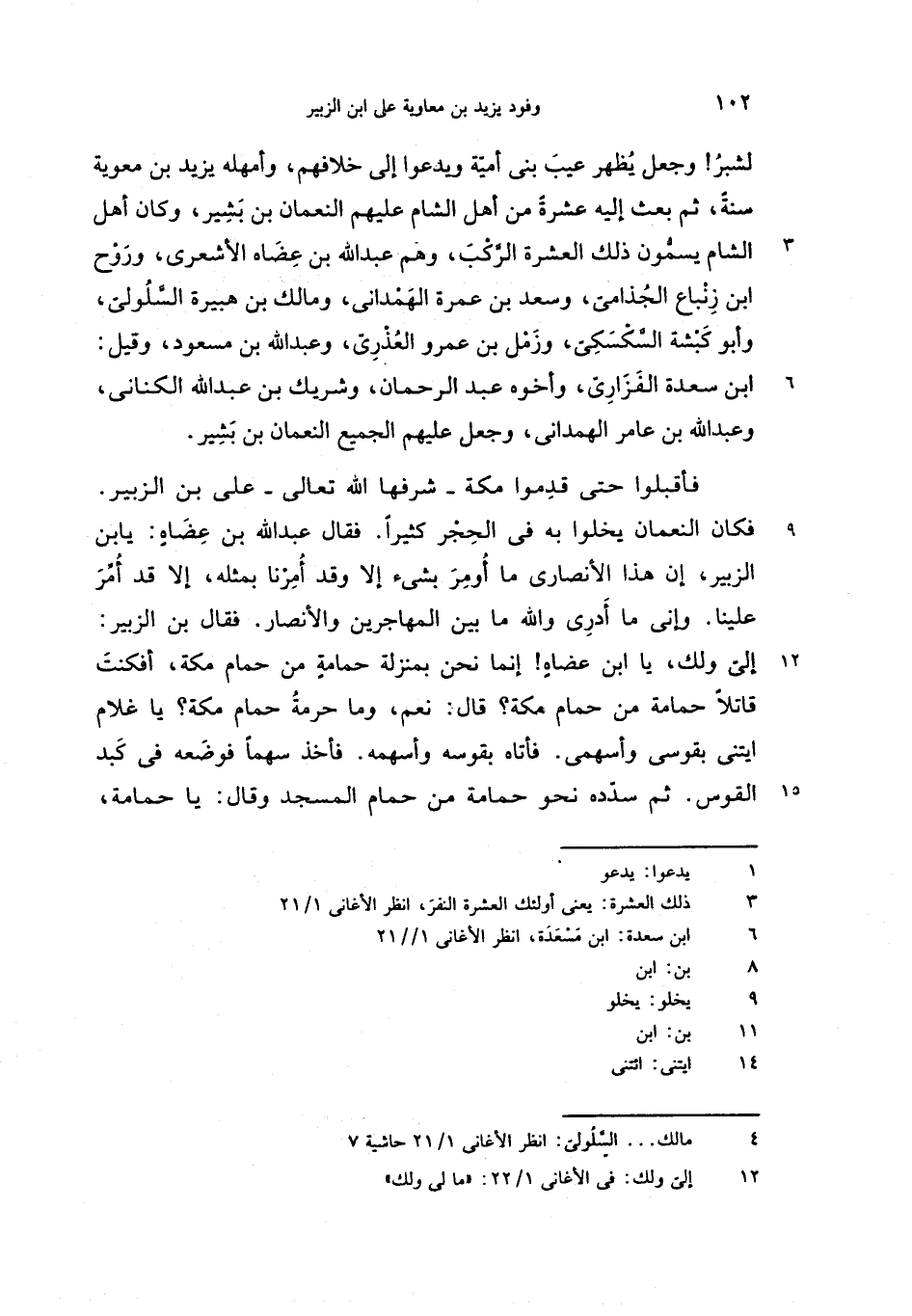 لشبر! وجعل يظهر عيب بنى أميّة ويدعوا إلى خلافهم، وأمهله يزيد بن معوية سنة، ثم بعث إليه عشرة من أهل الشام عليهم النعمان بن بشير، وكان أهل الشام يسمّون ذلك العشرة الرّكب، وهم عبد الله بن عضاه الأشعرى، وروح ابن زنباع الجذامىّ، وسعد بن عمرة الهمدانى، ومالك بن هبيرة السّلولىّ، وأبو كبشة السّكسكىّ، وزمل بن عمرو العذرىّ، وعبد الله بن مسعود، وقيل: