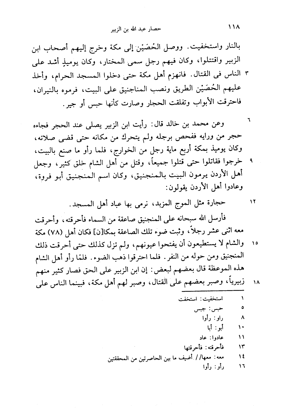 فأرسل الله سبحانه على المنجنيق صاعقة من السماء فأحرقته، وأحرقت معه اثنى عشر رجلا، وثبت ضوء تلك الصاعقة بمكا [ن] فكان أهل (78) مكة والشام لا يستطيعون أن يفتحوا عيونهم، ولم تزل كذلك حتى أحرقت ذلك المنجنيق ومن حوله من النفر. فلما احترقوا ذهب الضوء. فلمّا رأو أهل الشام هذه الموعظة قال بعضهم لبعض: إن ابن الزبير على الحق فصار كثير منهم زبيريا، وصبر بعضهم على القتال، وصبر لهم أهل مكة، فبينما الناس على